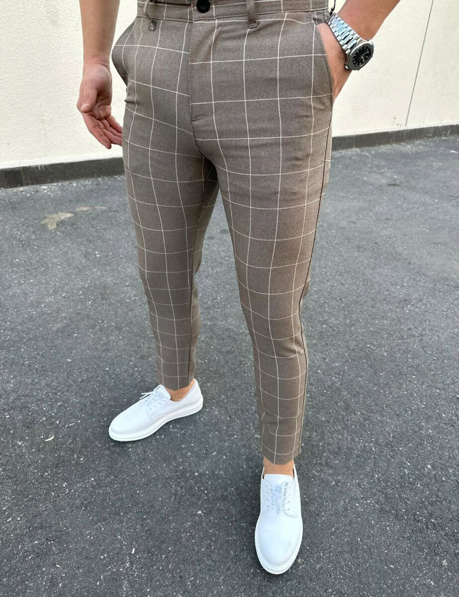 | Popis | Pánske štýlové nohavice hnedé, károvaný vzor, zapínanie na zips a gombík, dve predné vrecká, dve zadné vrecká. |