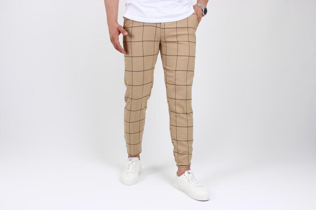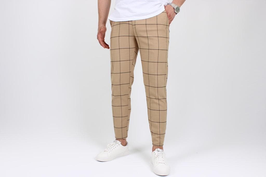 | Popis | Pánske štýlové svetlo hnedé nohavice , károvaný vzor, zapínanie na zips a gombík, dve predné vrecká, dve zadné vrecká. |