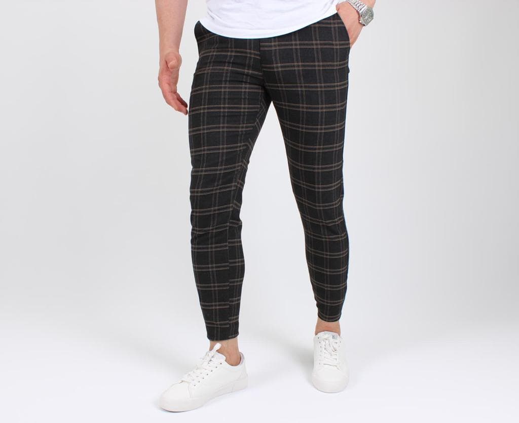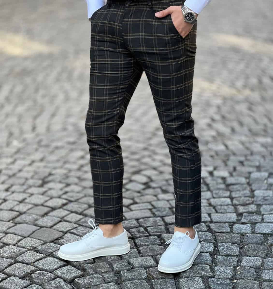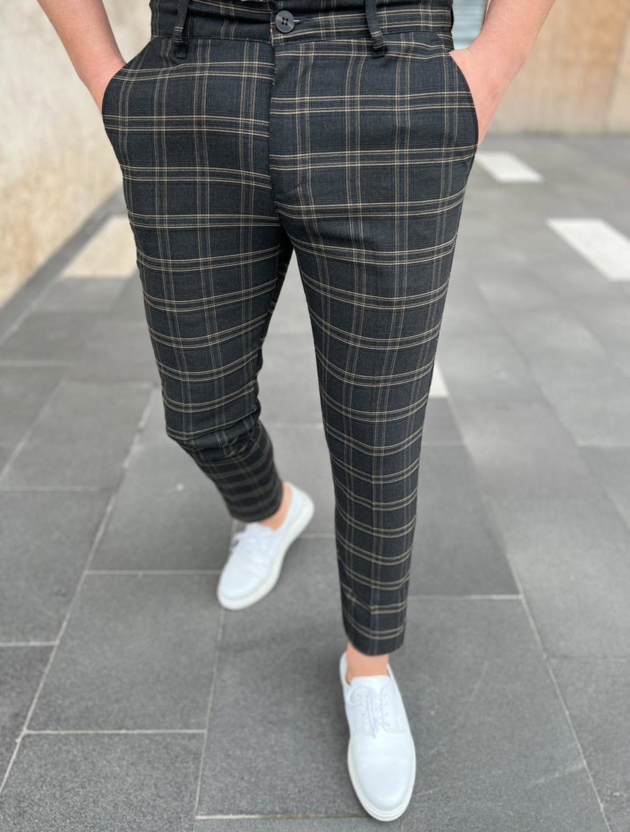 | Popis | Pánske elegantné nohavice, károvaný vzor, zapínanie na zips a gombík, dve predné vrecká, dve zadné vrecká. |