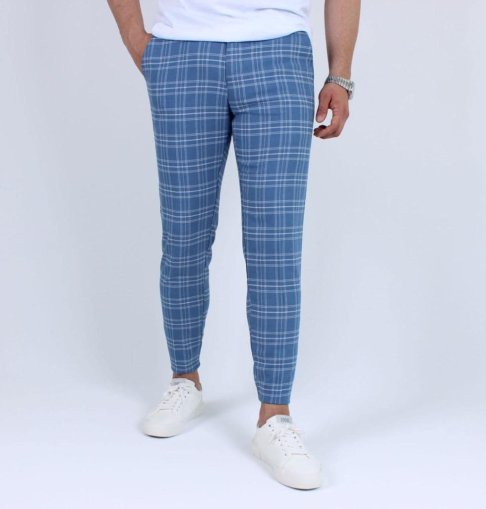 | Popis | Pánske štýlové modré nohavice , károvaný vzor, zapínanie na zips a gombík, dve predné vrecká, dve zadné vrecká. |