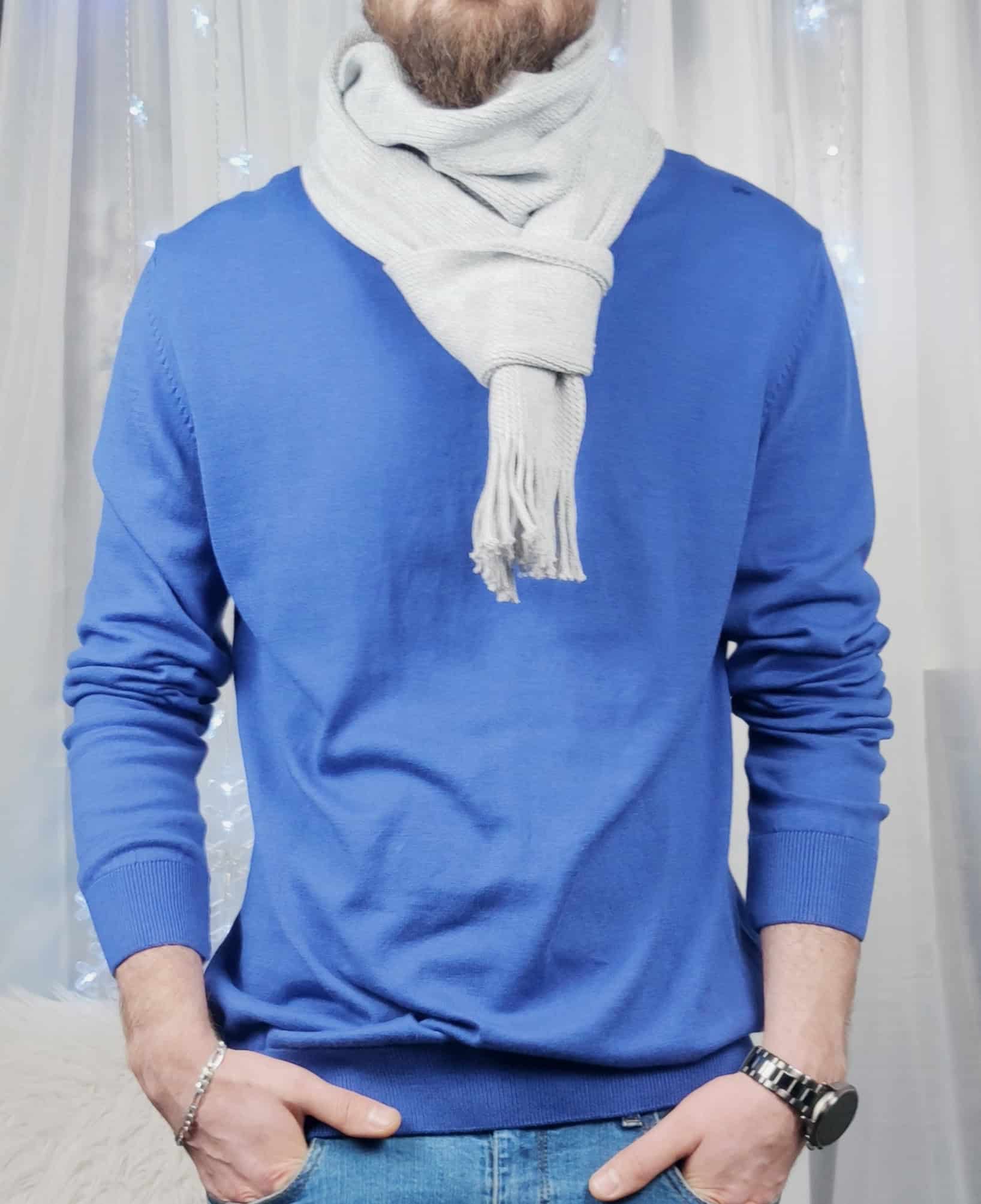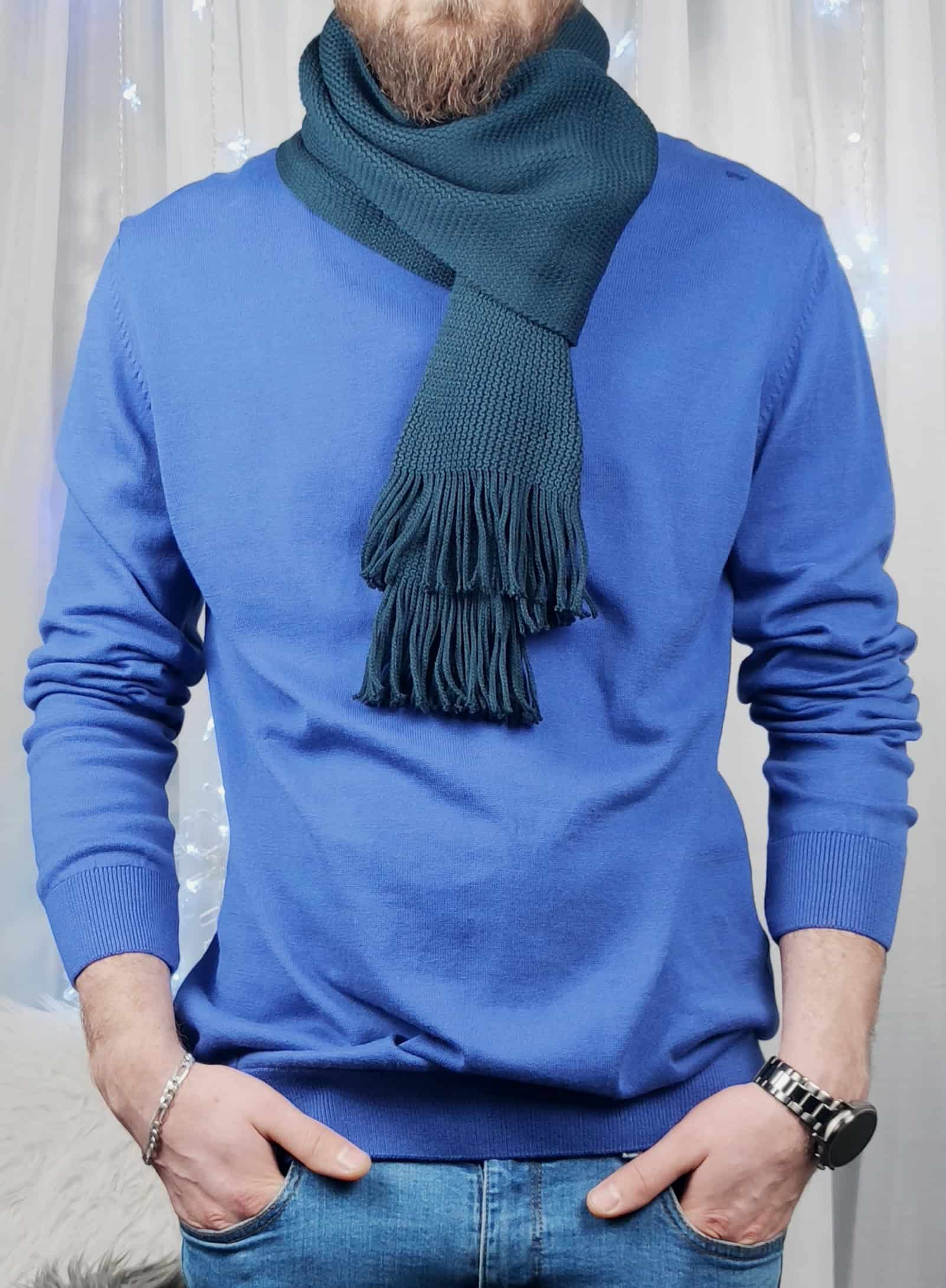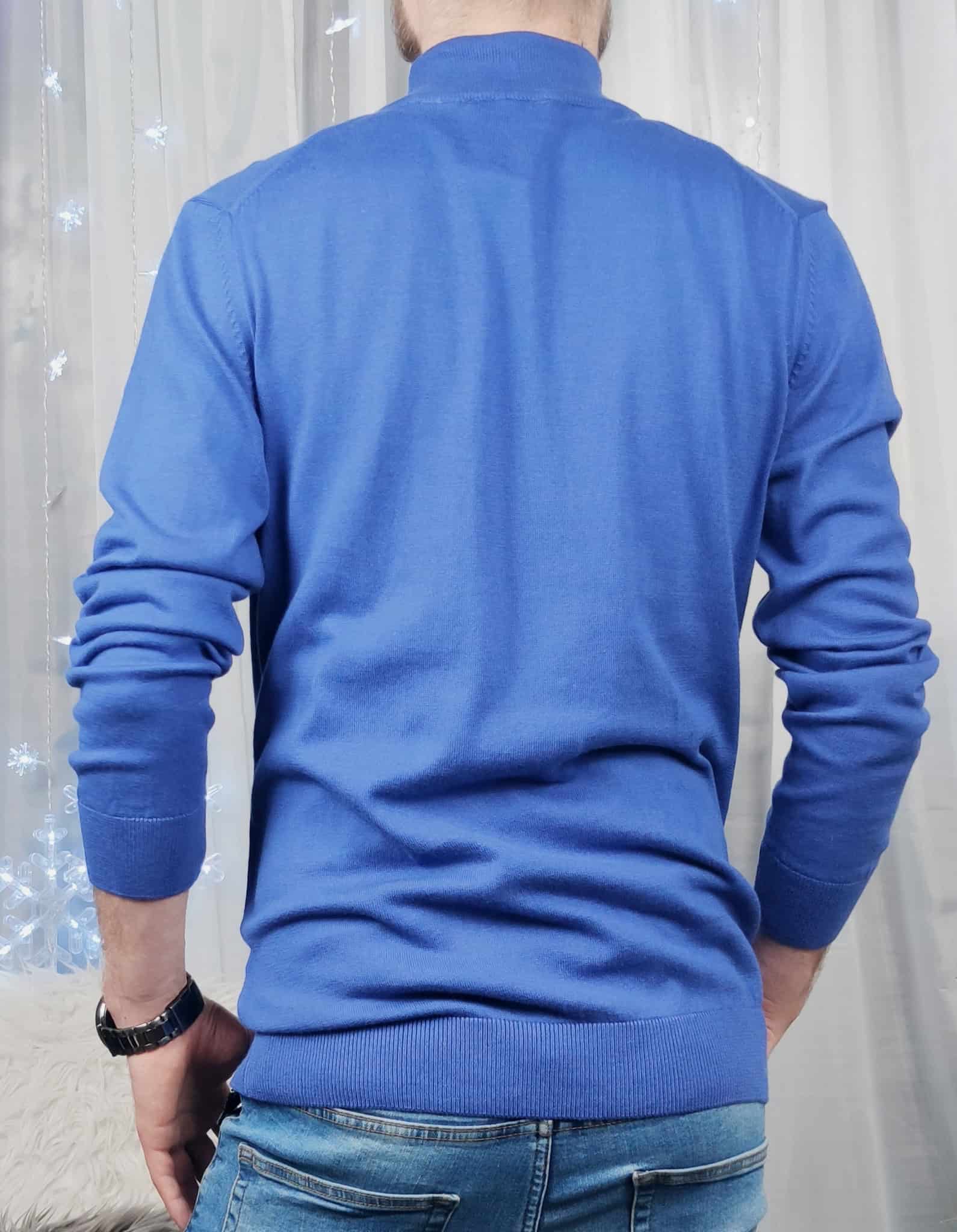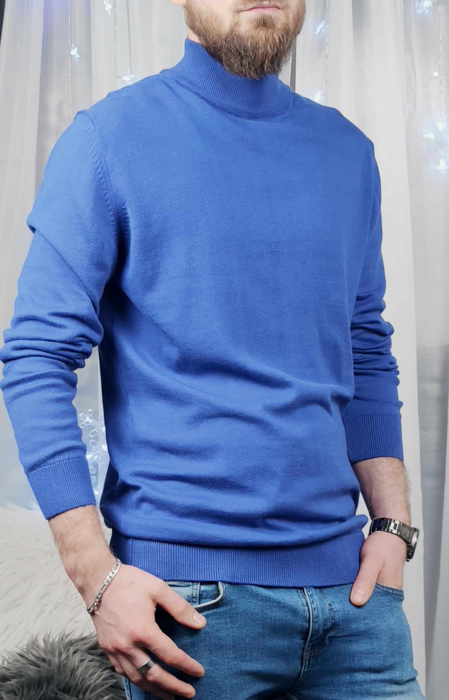 Pánsky elegantný modrý polorolák. Spodná časť a rukávy sú ukončené lemom.