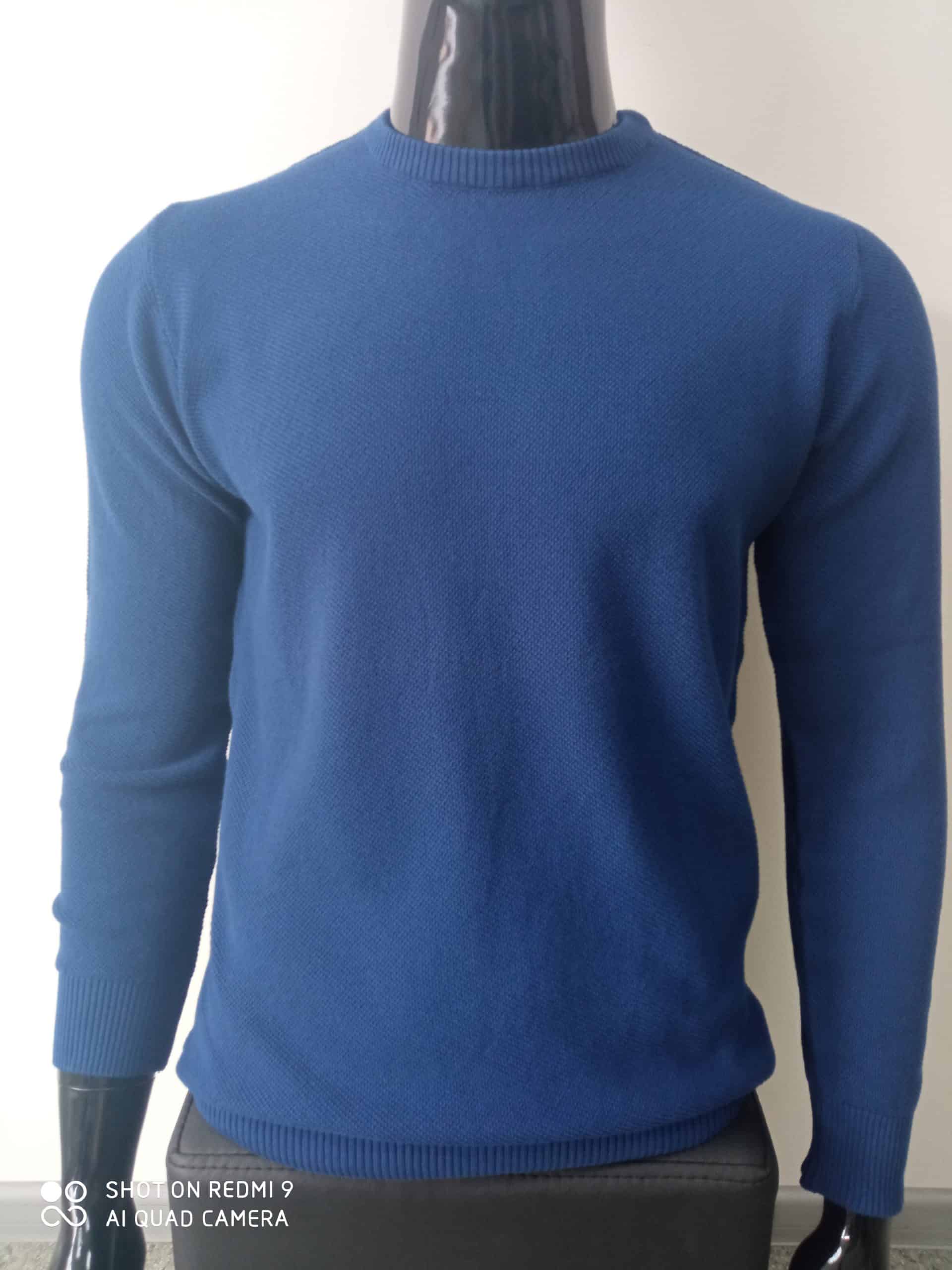 Pánsky elegantný modrý sveter, okrúhly výstrih. Spodná časť a rukávy sú ukončené lemom.