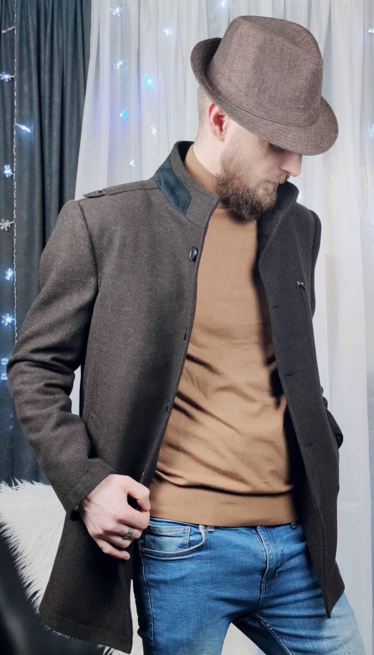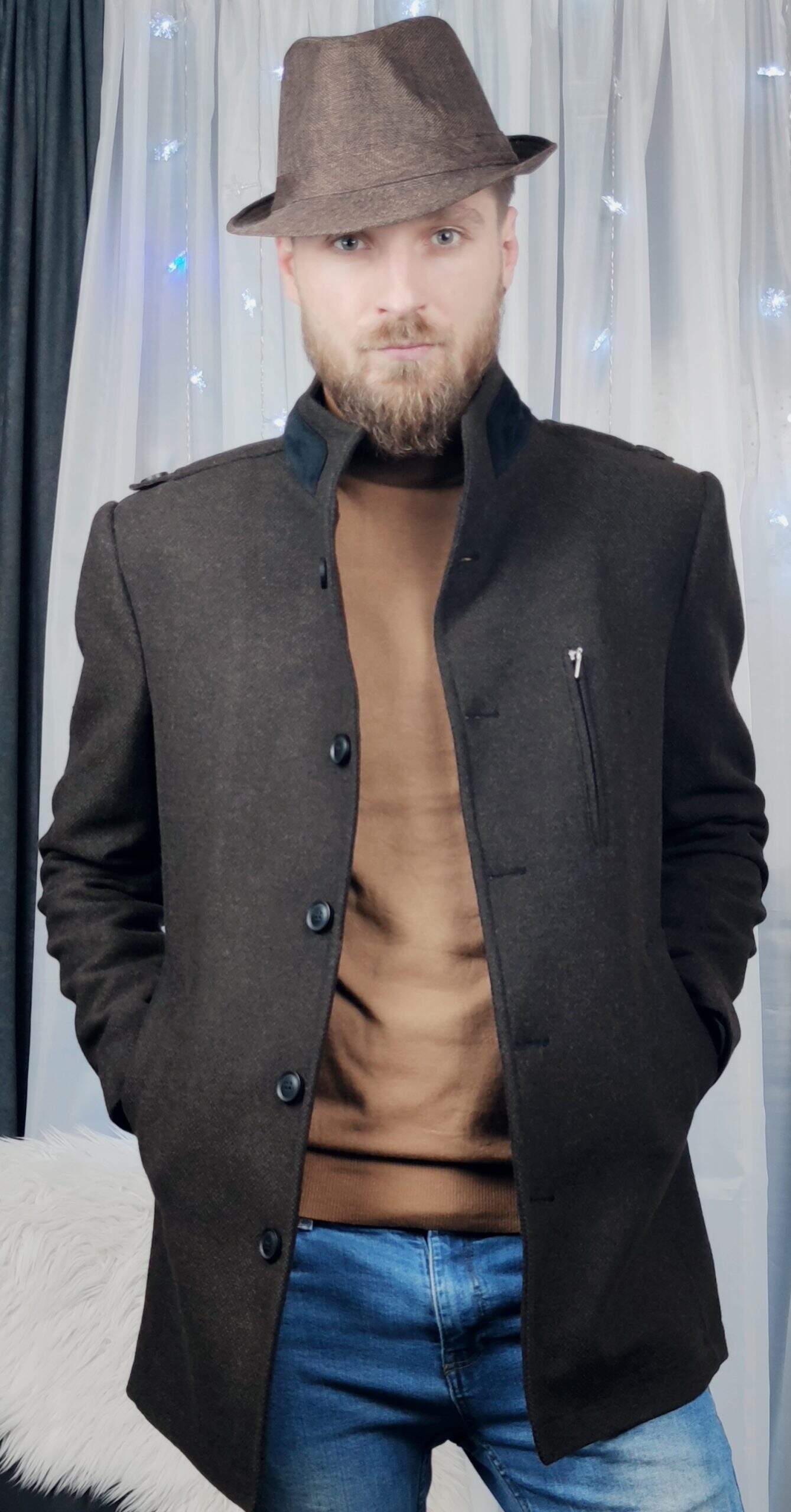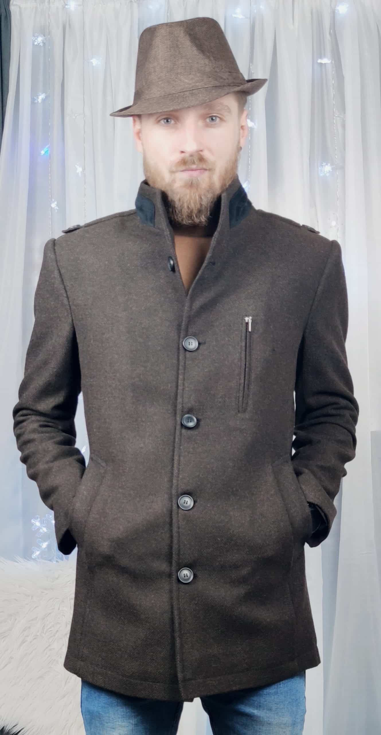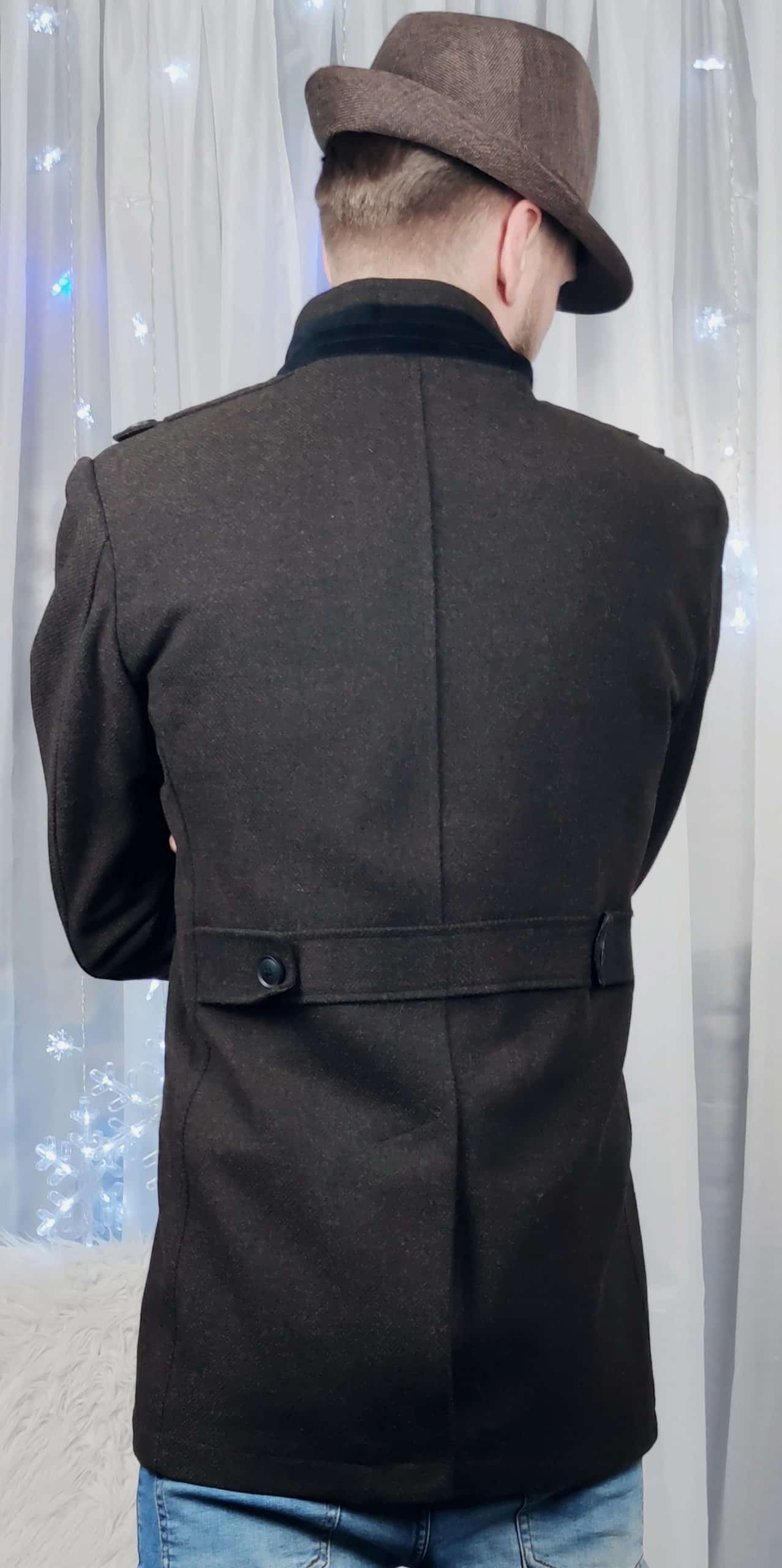 Pánsky elegantný hnedý kabát, zapínanie na gombíky, náprsné vrecko so zipsom, ,,výložky" na pleciach, dve vonkajšie vrecká