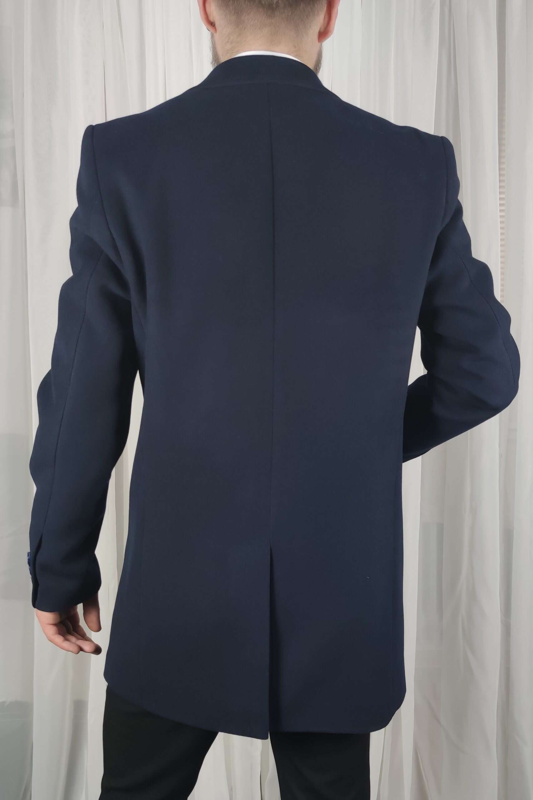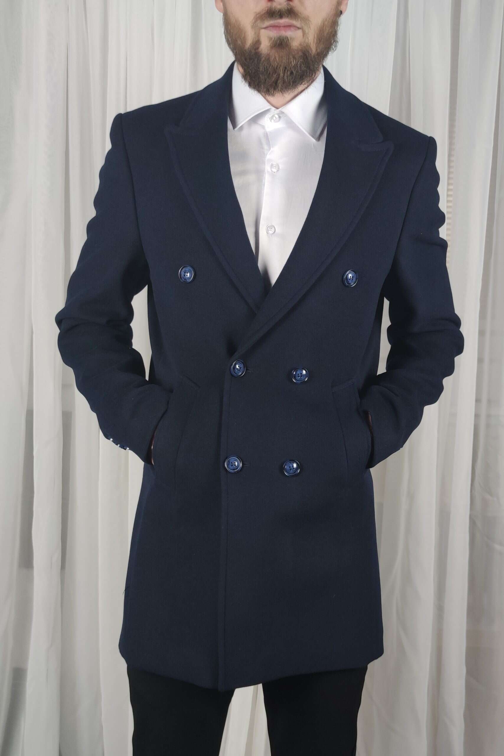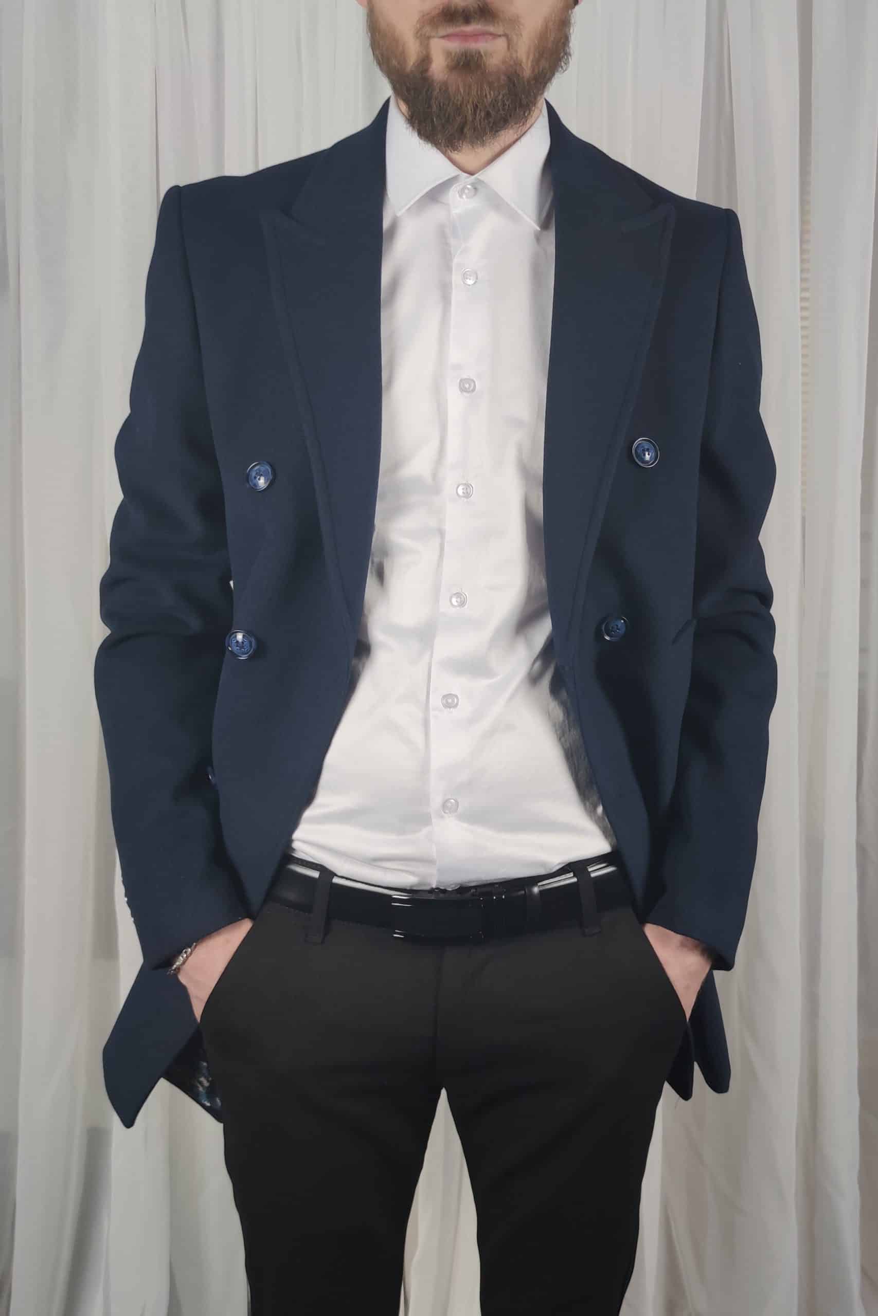 | Popis | Pánsky elegantný kabát, tmavomodrá farba, dvojradové zapínanie, fazónkový golier,dve predné vrecká. Rázporok v zadu a ozdobné gombíky na rukávoch. |