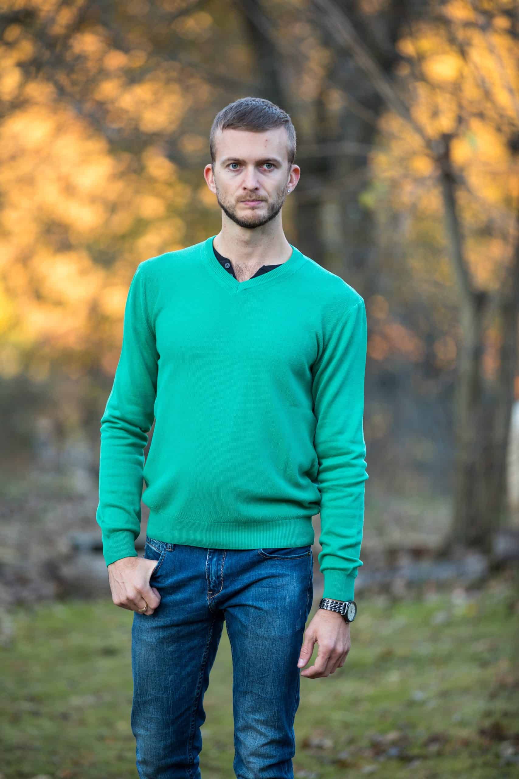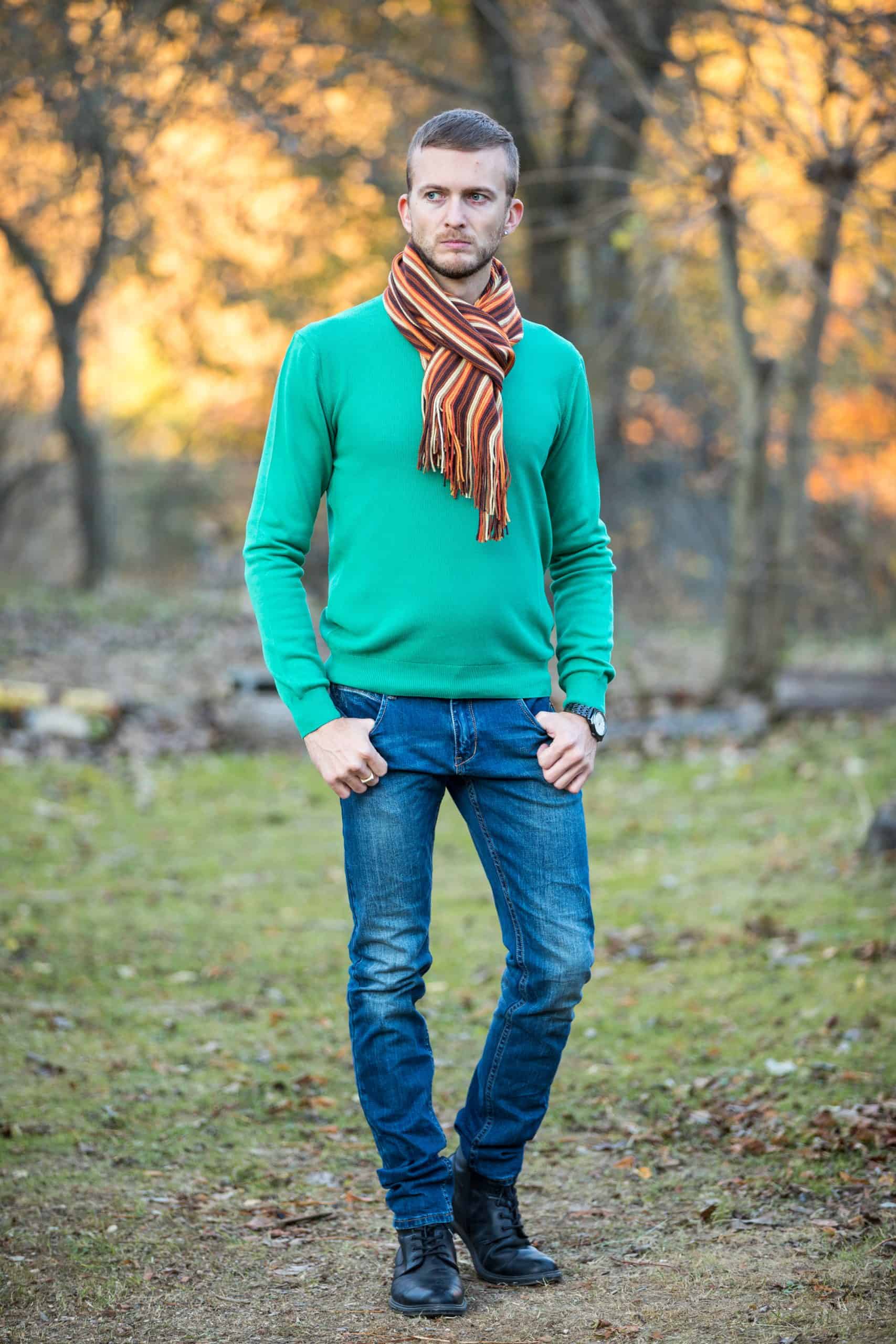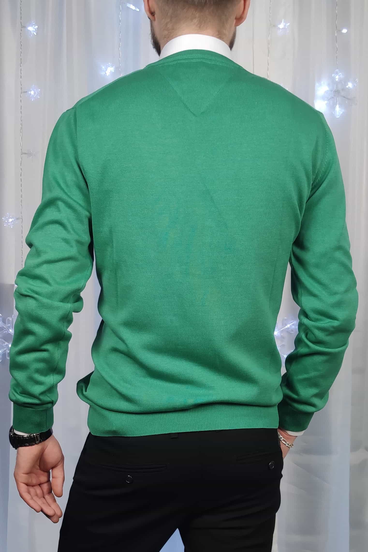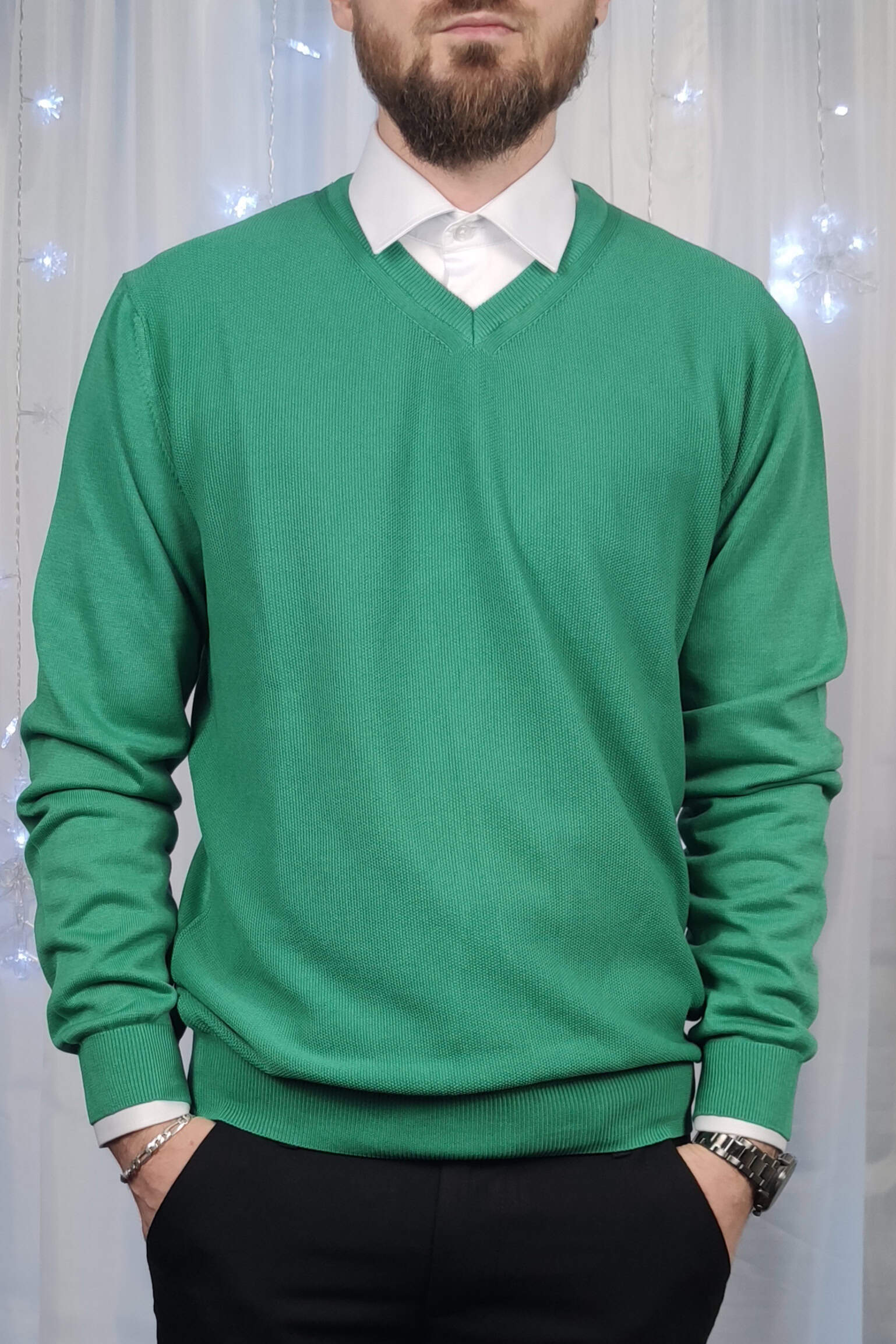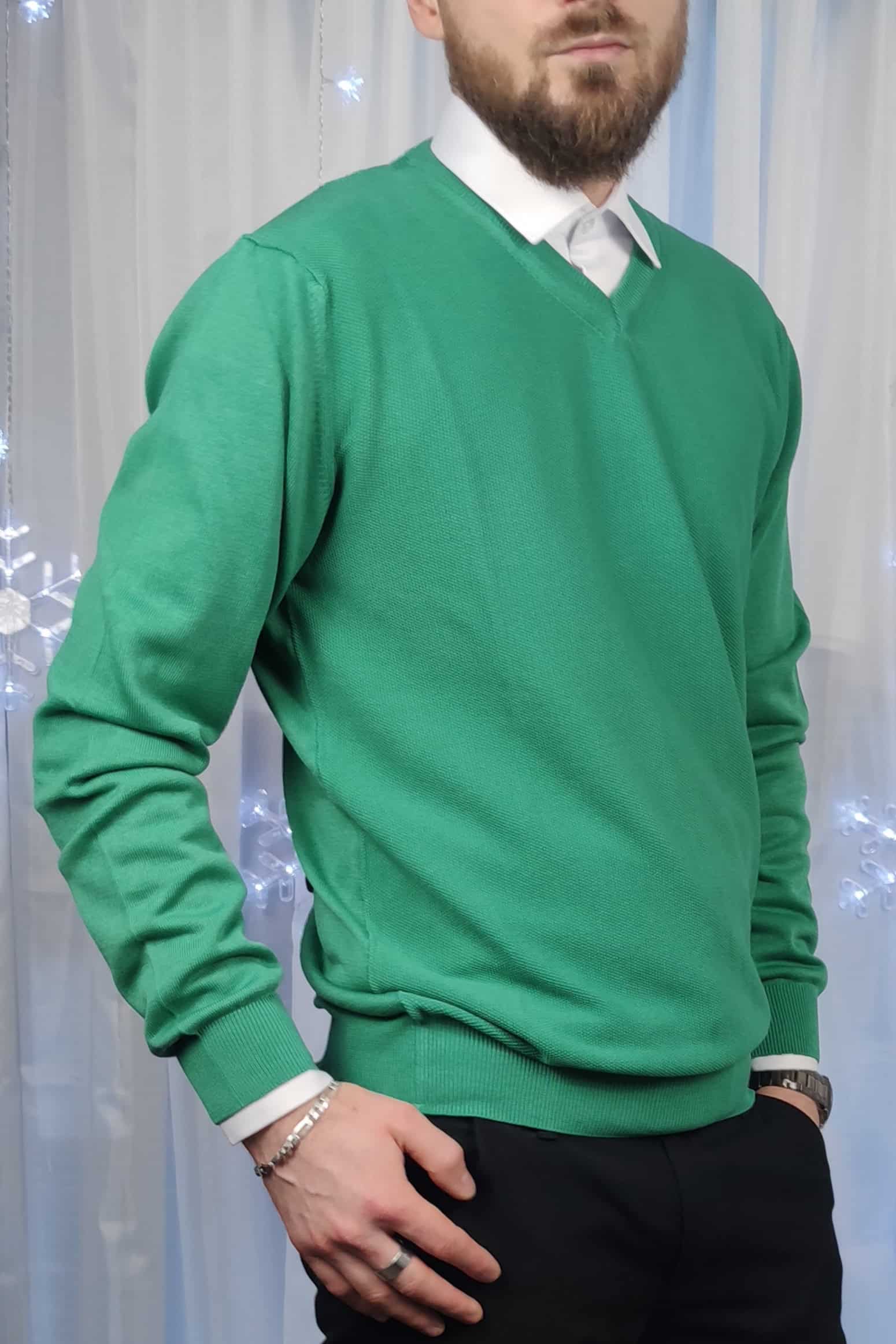 | Popis | Pánsky elegantný zelený sveter, večkový výstrih. Spodná časť a rukávy sú ukončené lemom. |