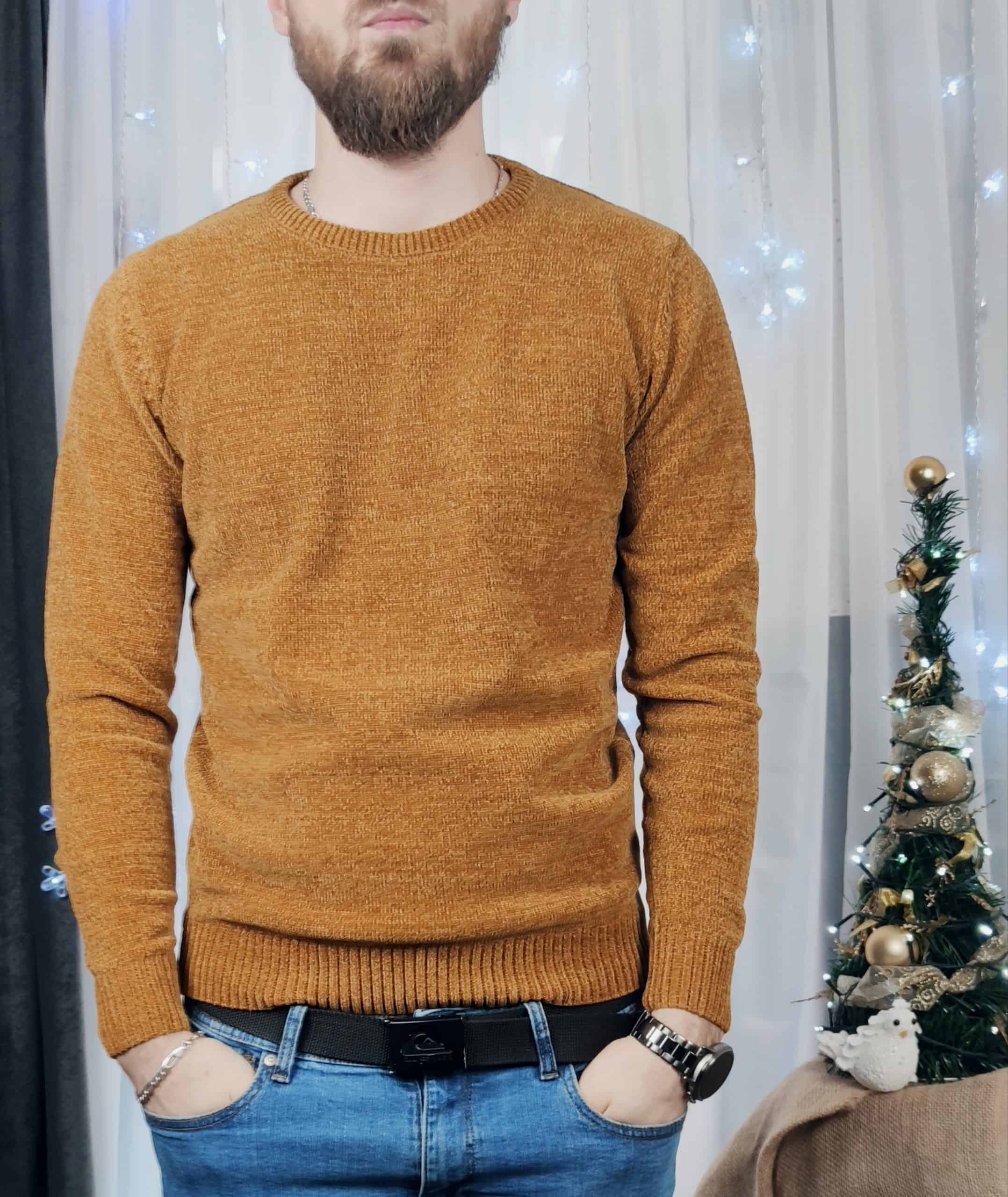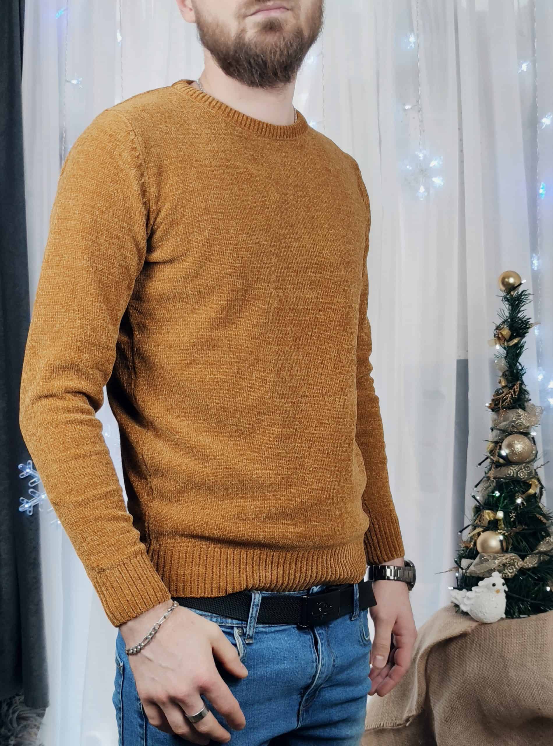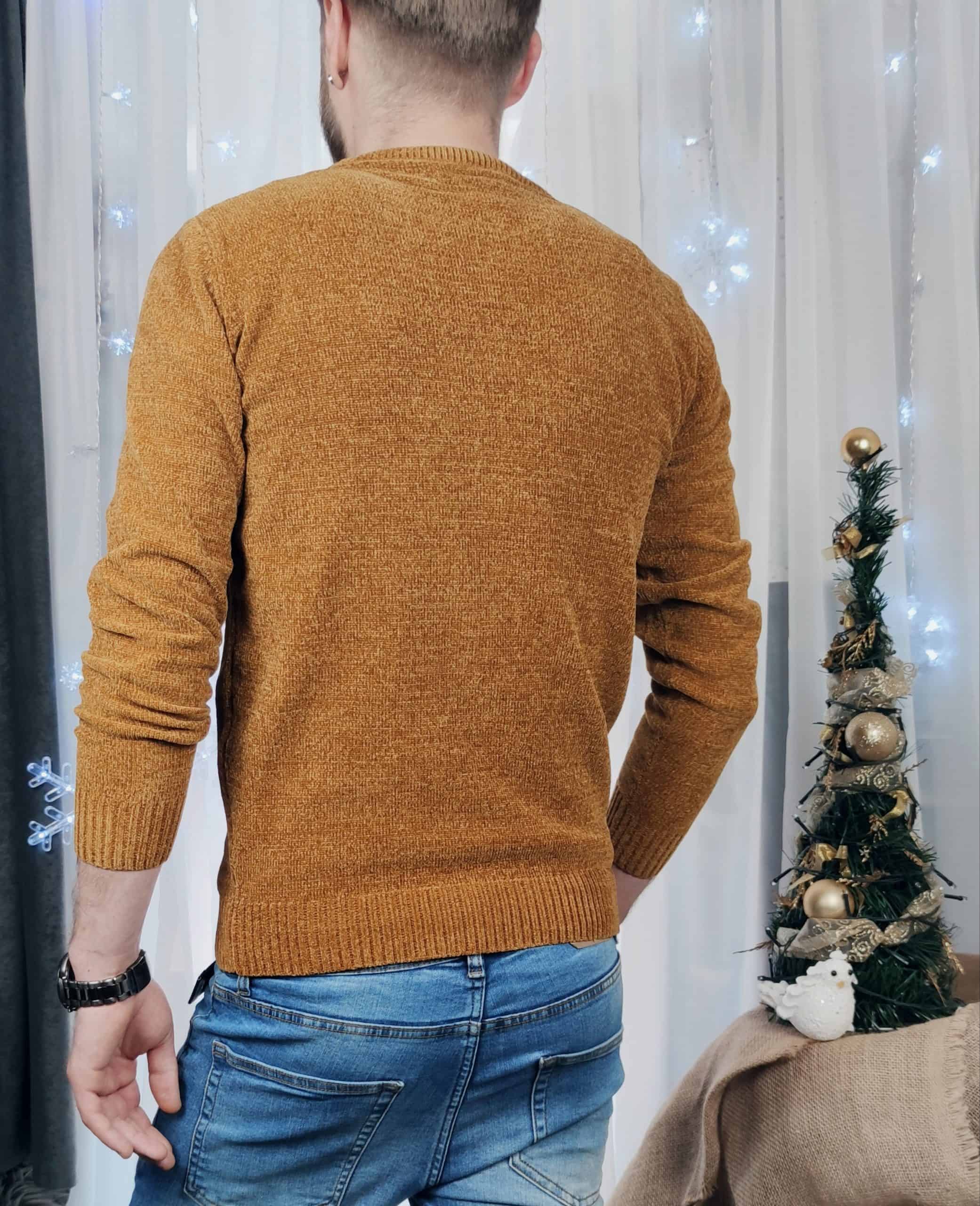 Pánsky horčicový sveter, okrúhly výstrih. Spodná časť a rukávy sú ukončené lemom.