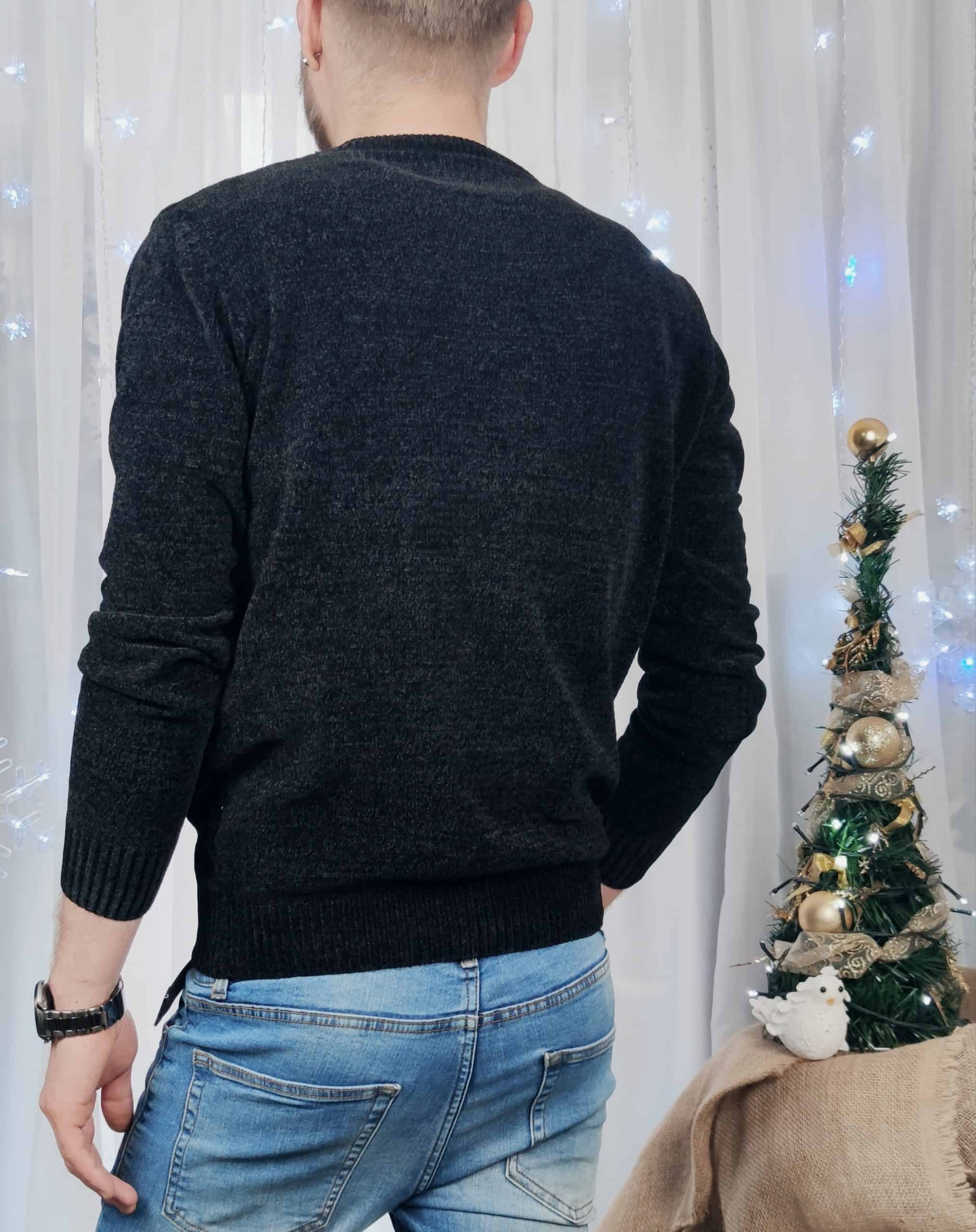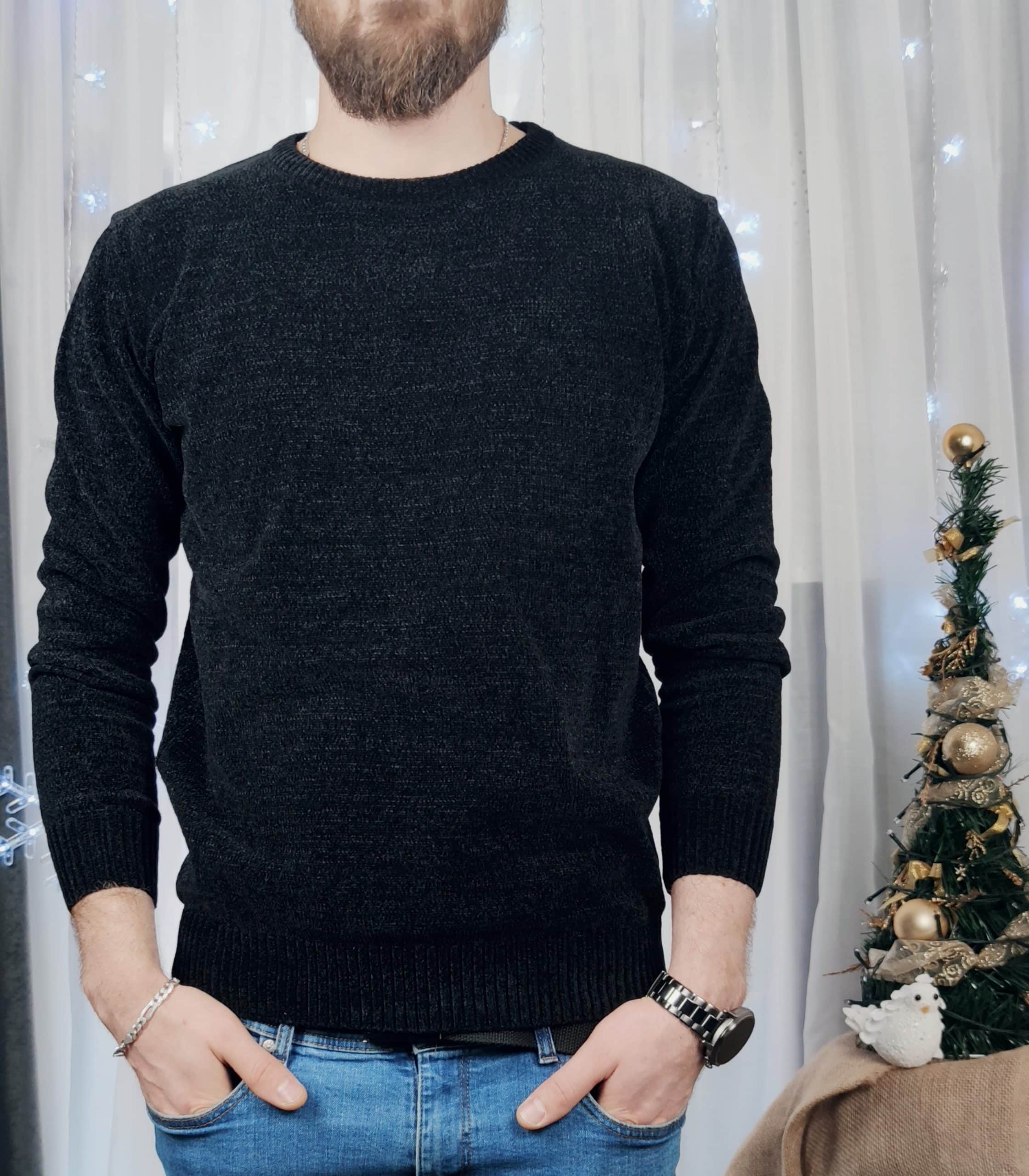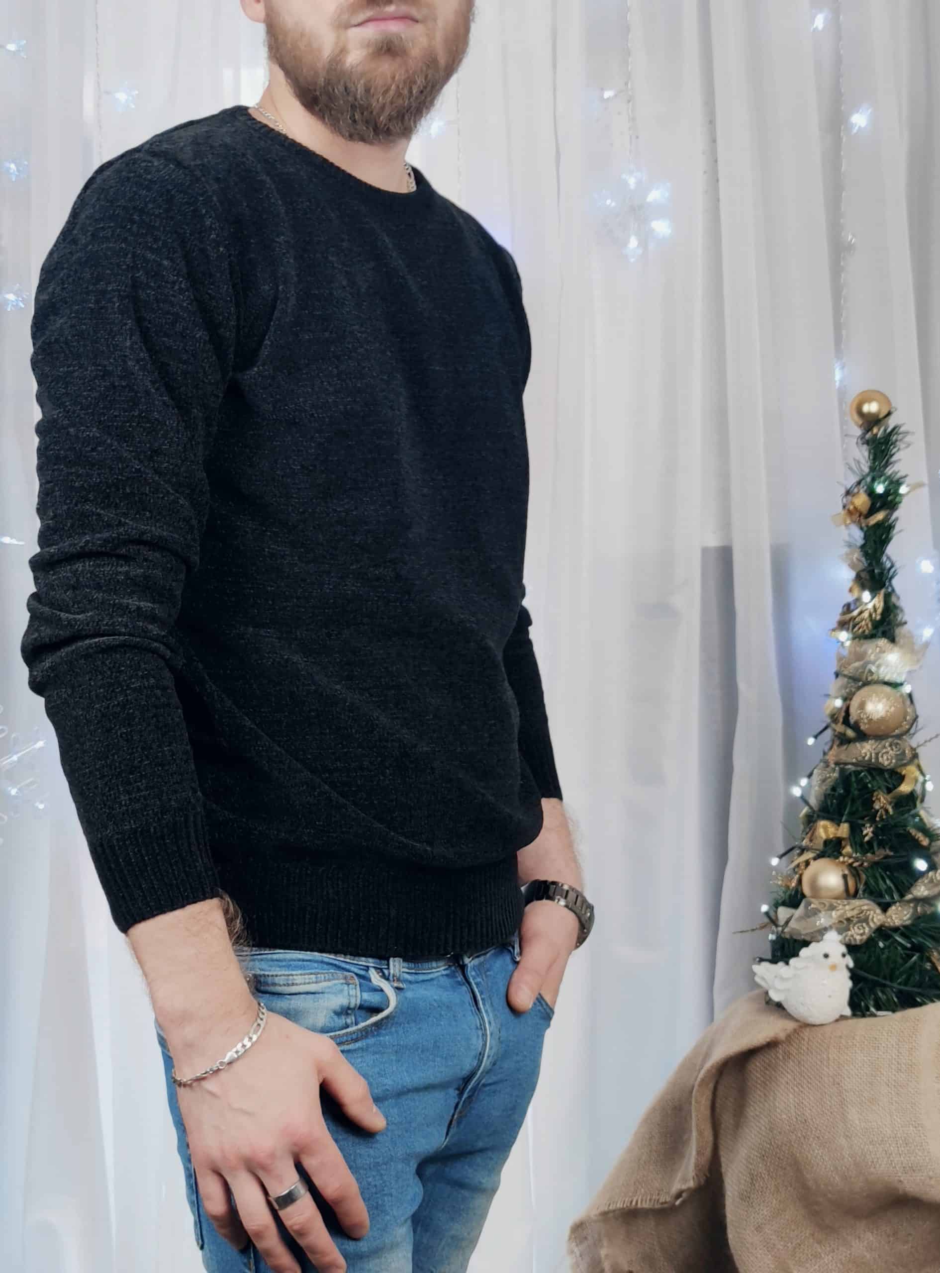 Pánsky horčicový sveter, okrúhly výstrih. Spodná časť a rukávy sú ukončené lemom.