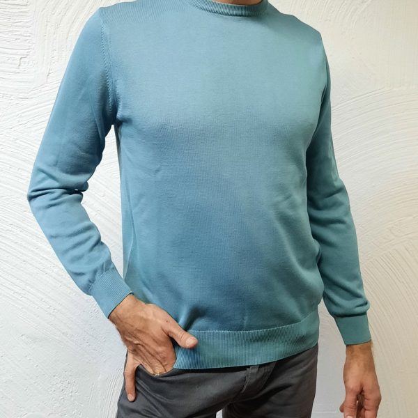 Pánska elegantný svetlomodrý sveter, okrúhly výstrih. Spodná časť a rukávy sú ukončené lemom.