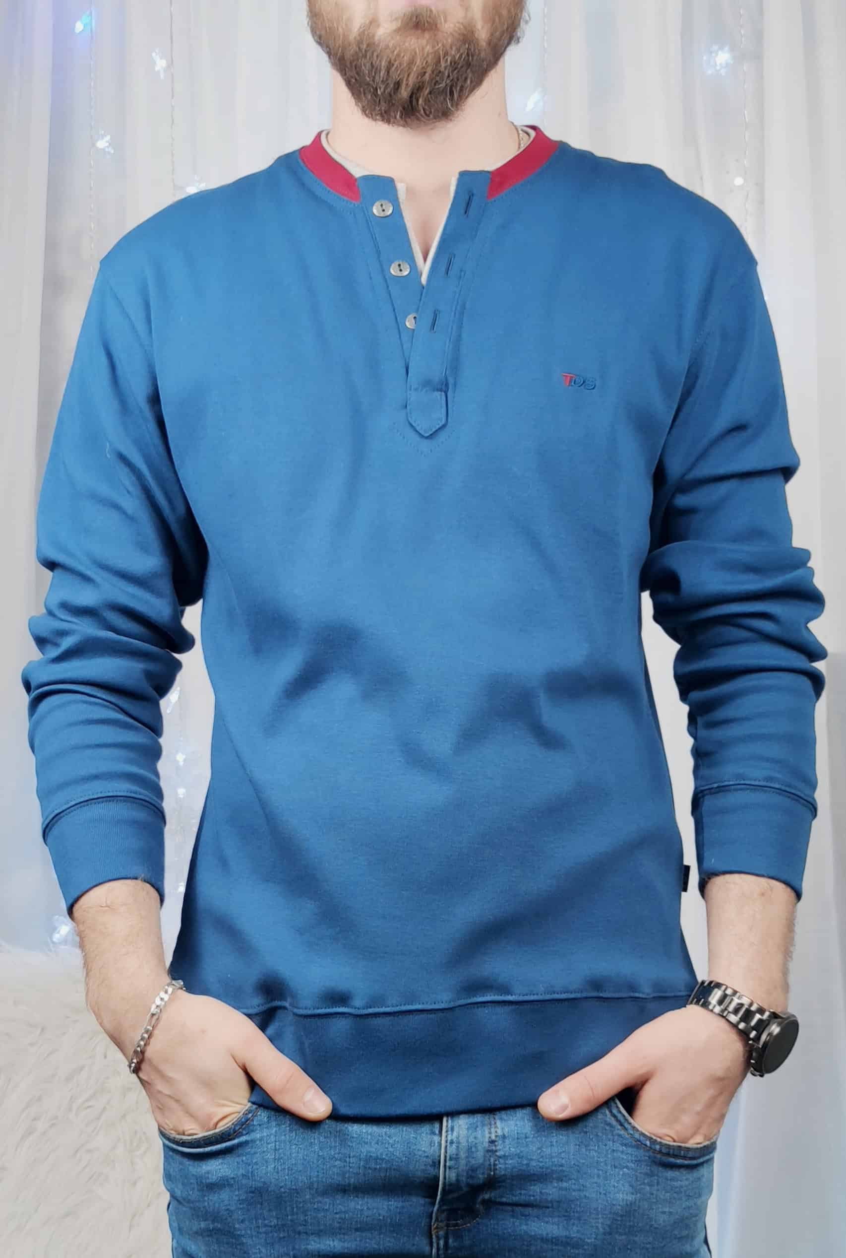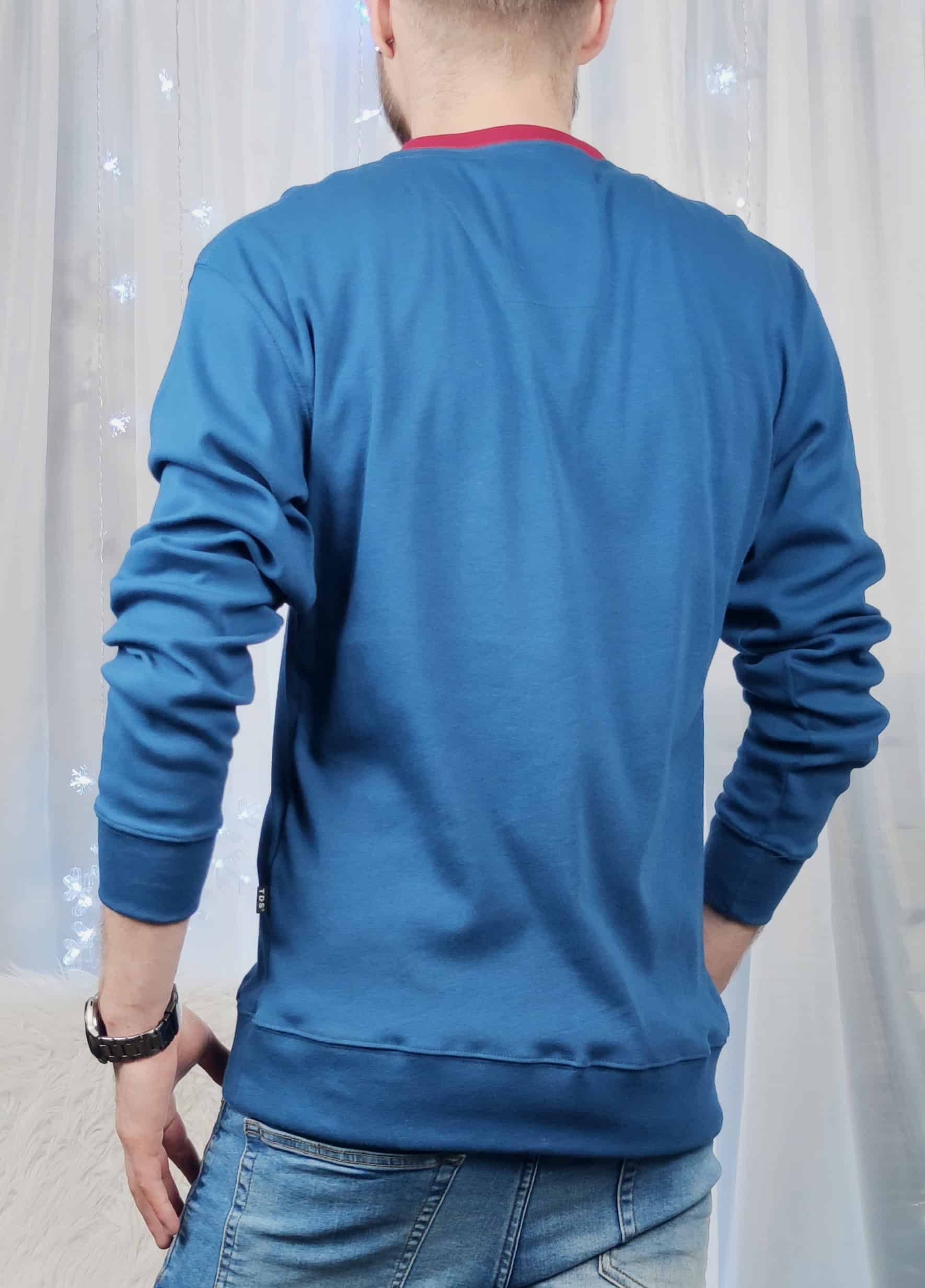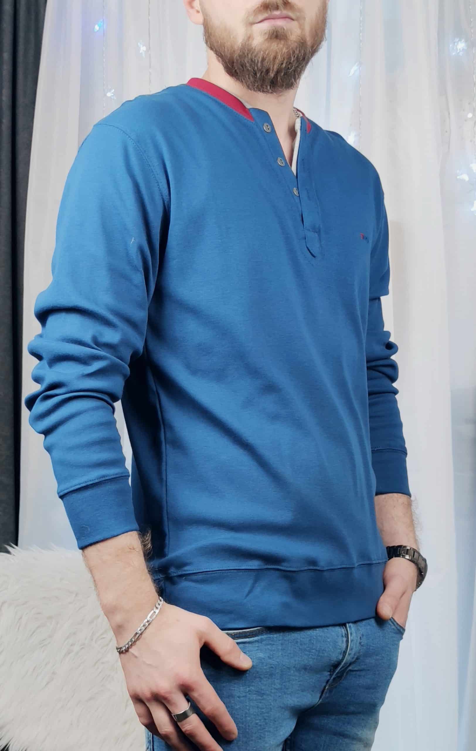 | Popis | Pánska modrá mikina, zapínanie na gombíky, okrúhly výstrih. Spodná časť a rukávy sú ukončené lemom. |