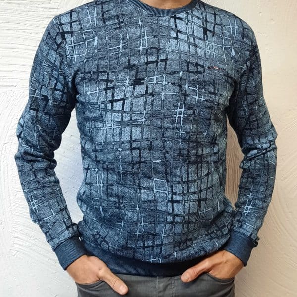 | Popis | Pánska modrá mikina so vzorom, okrúhlym výstrihom. Spodná časť a rukávy sú ukončené lemom. |