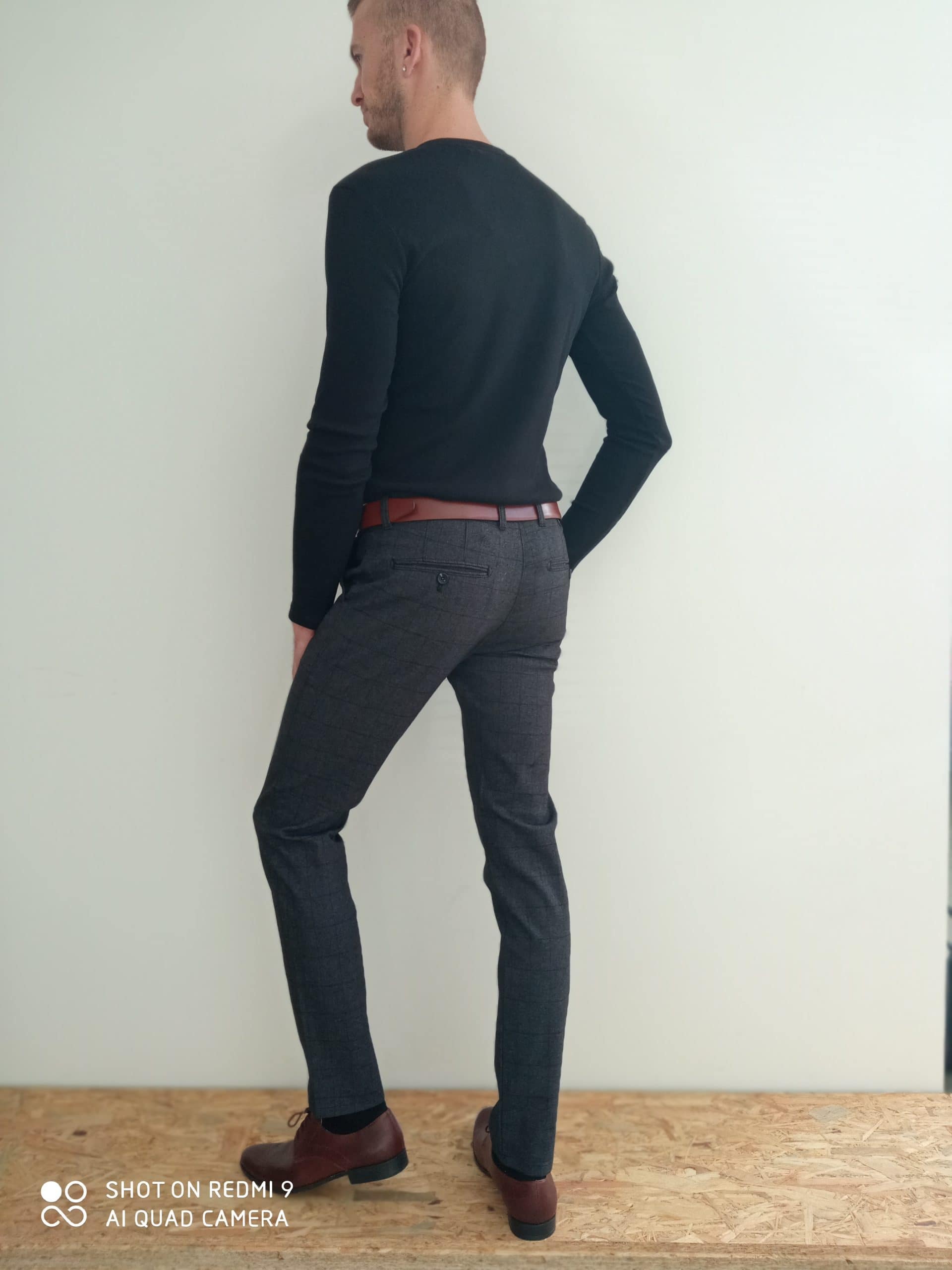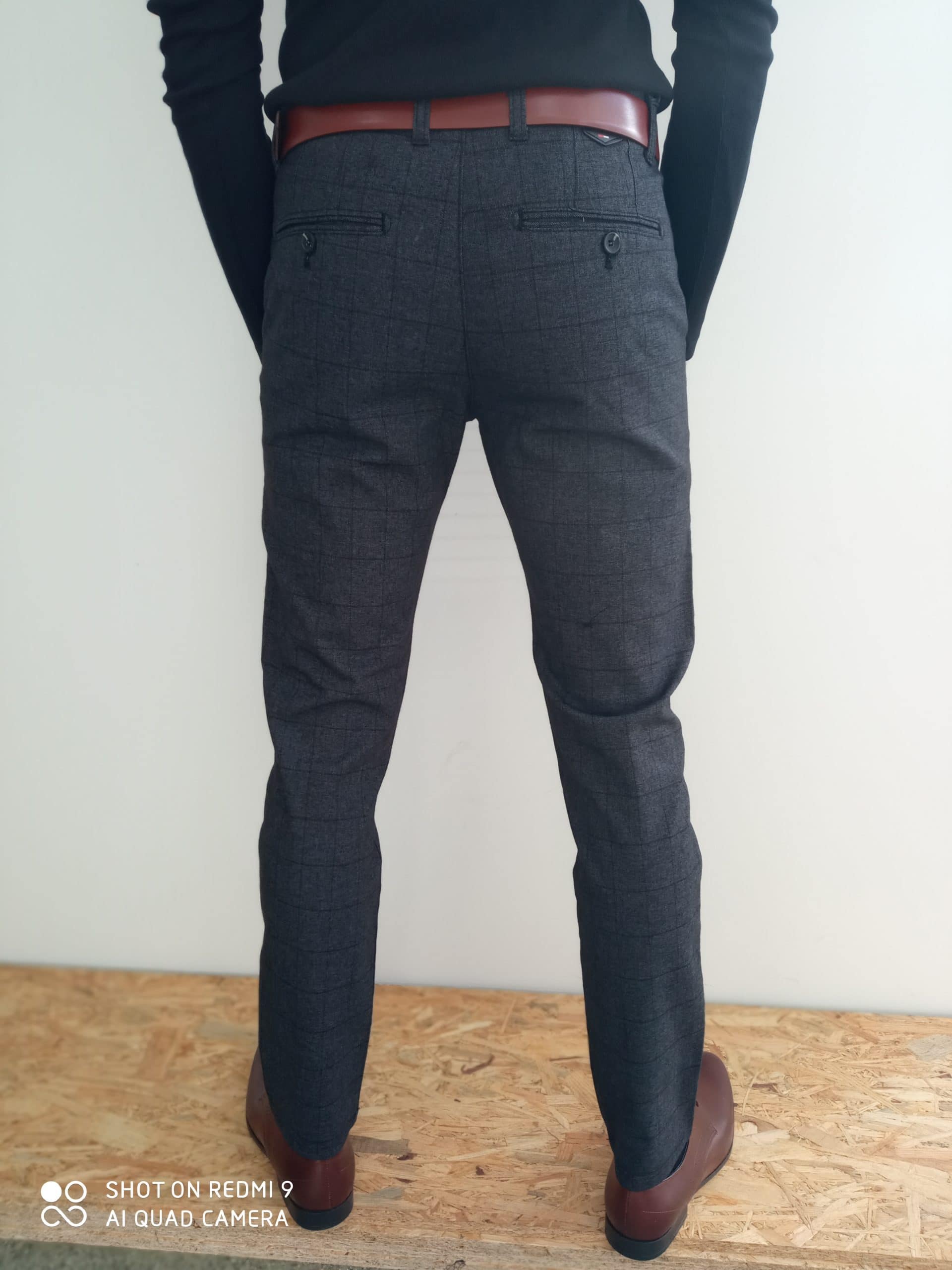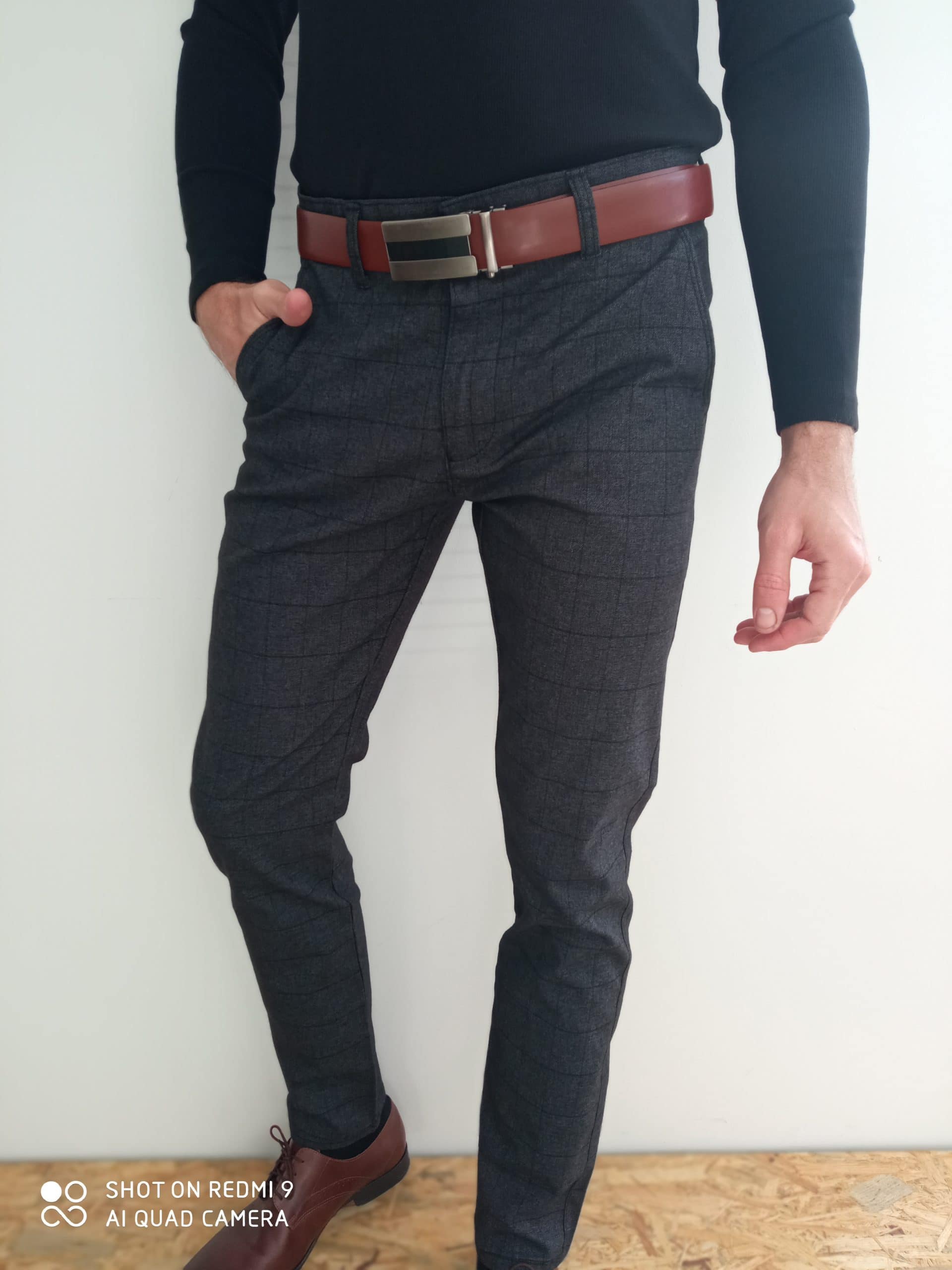 Pánske elegantné čierne nohavice, zapínanie na zips a gombík, károvaný vzor, dve vonkajšie predné vrecká, dve zadné vrecka.