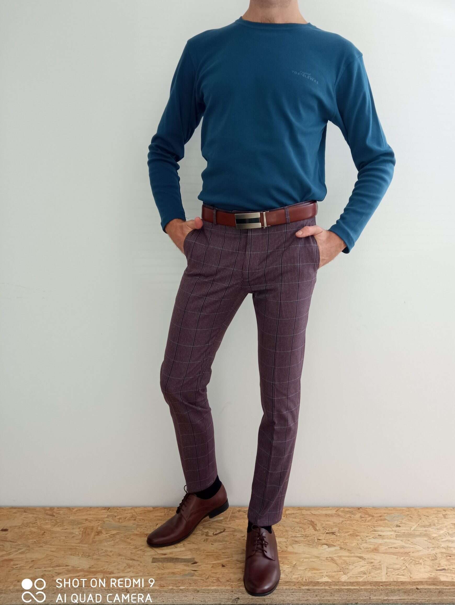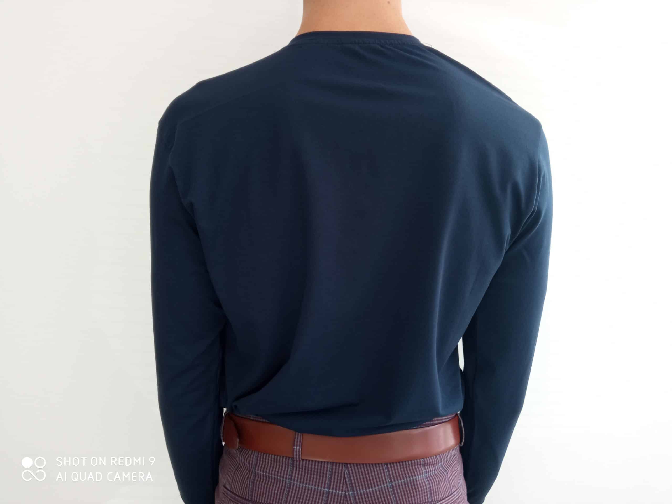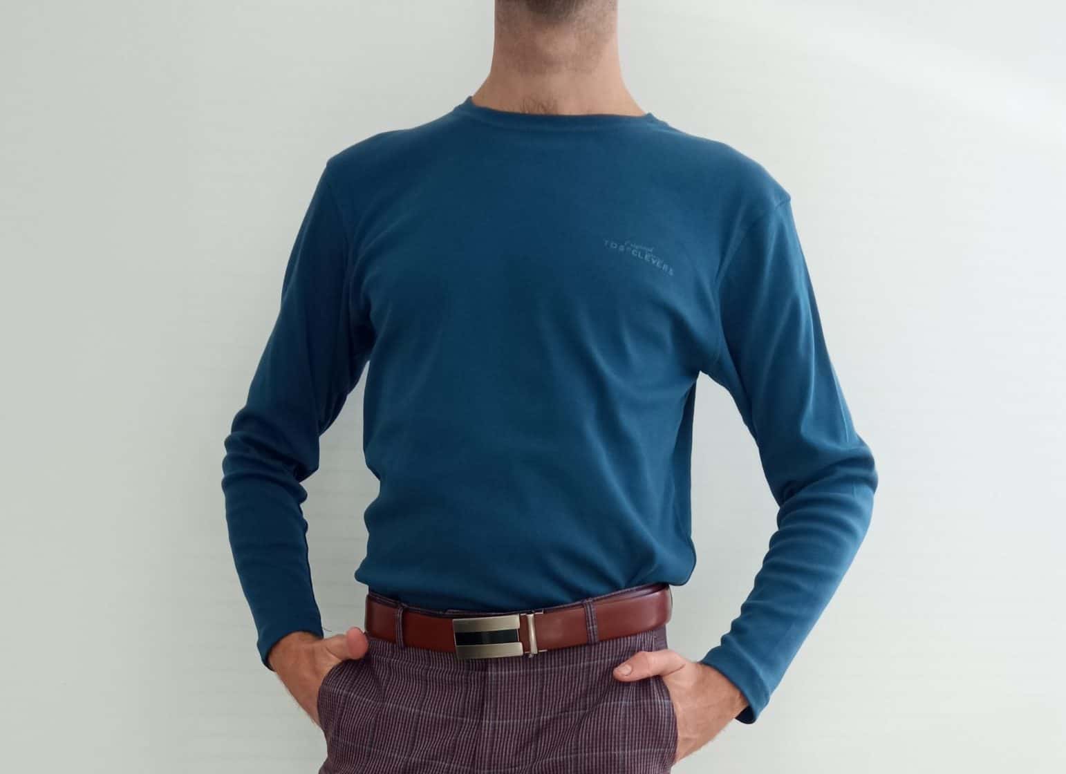 | Popis | Pánske modré tričko, okrúhly výstrih. |