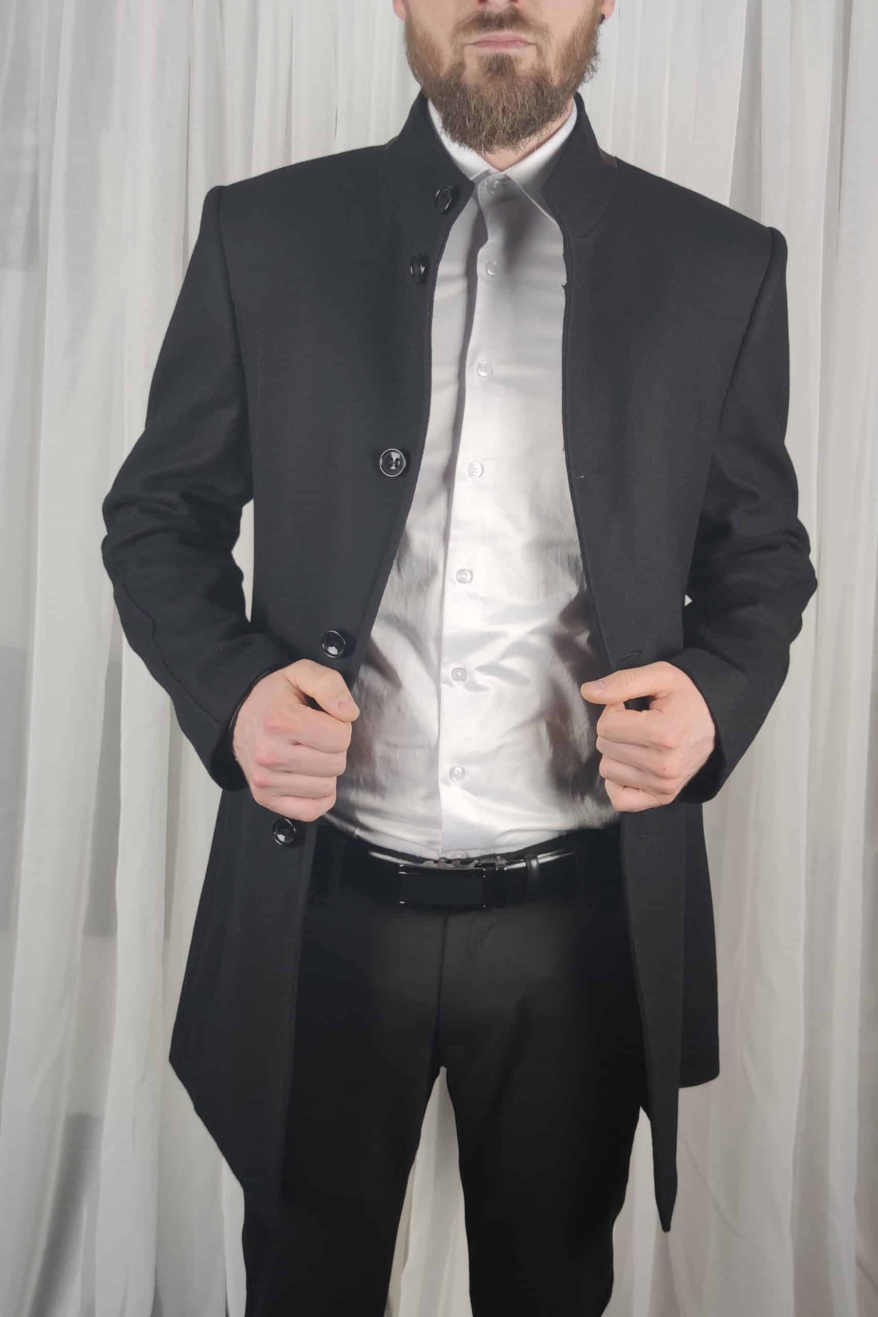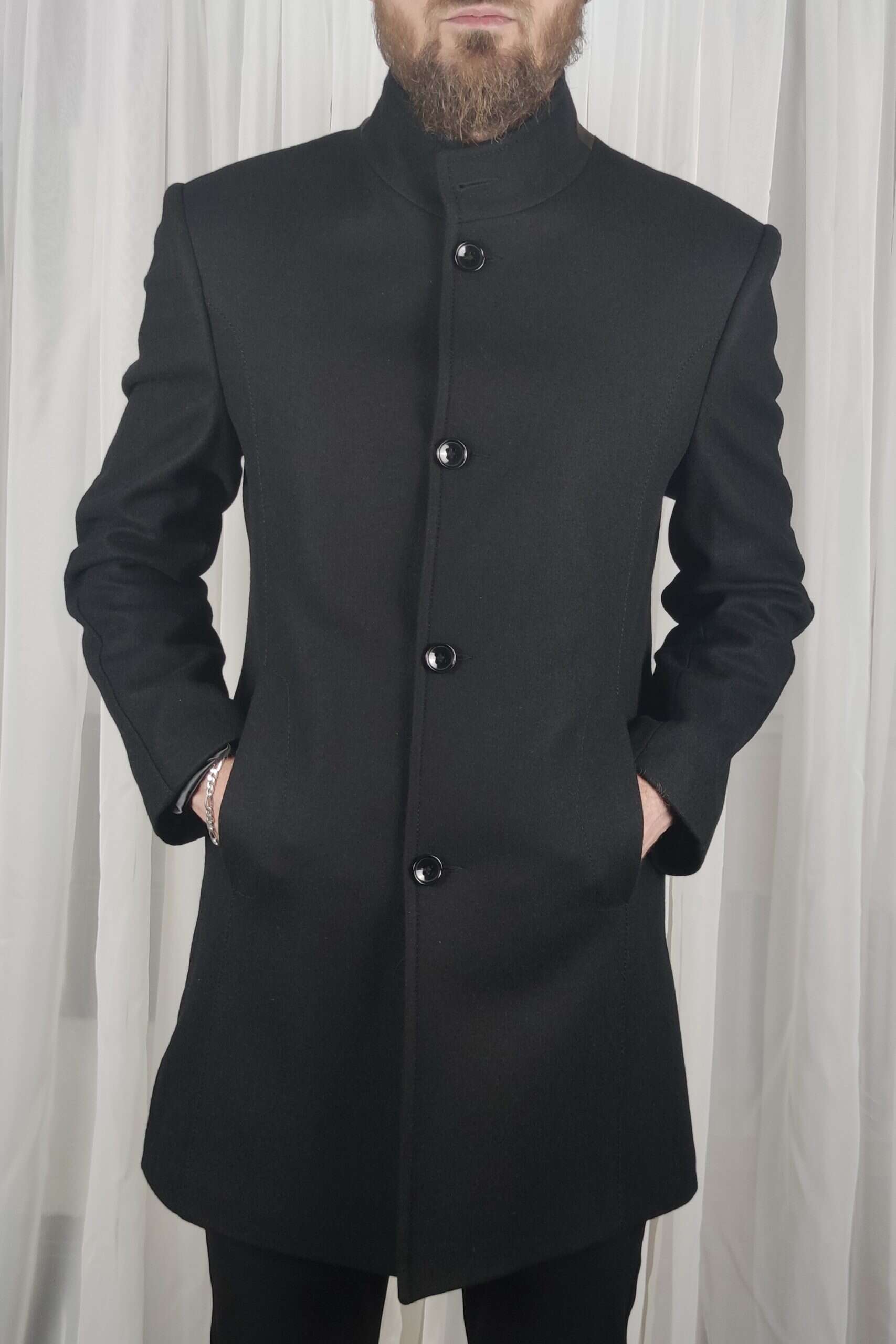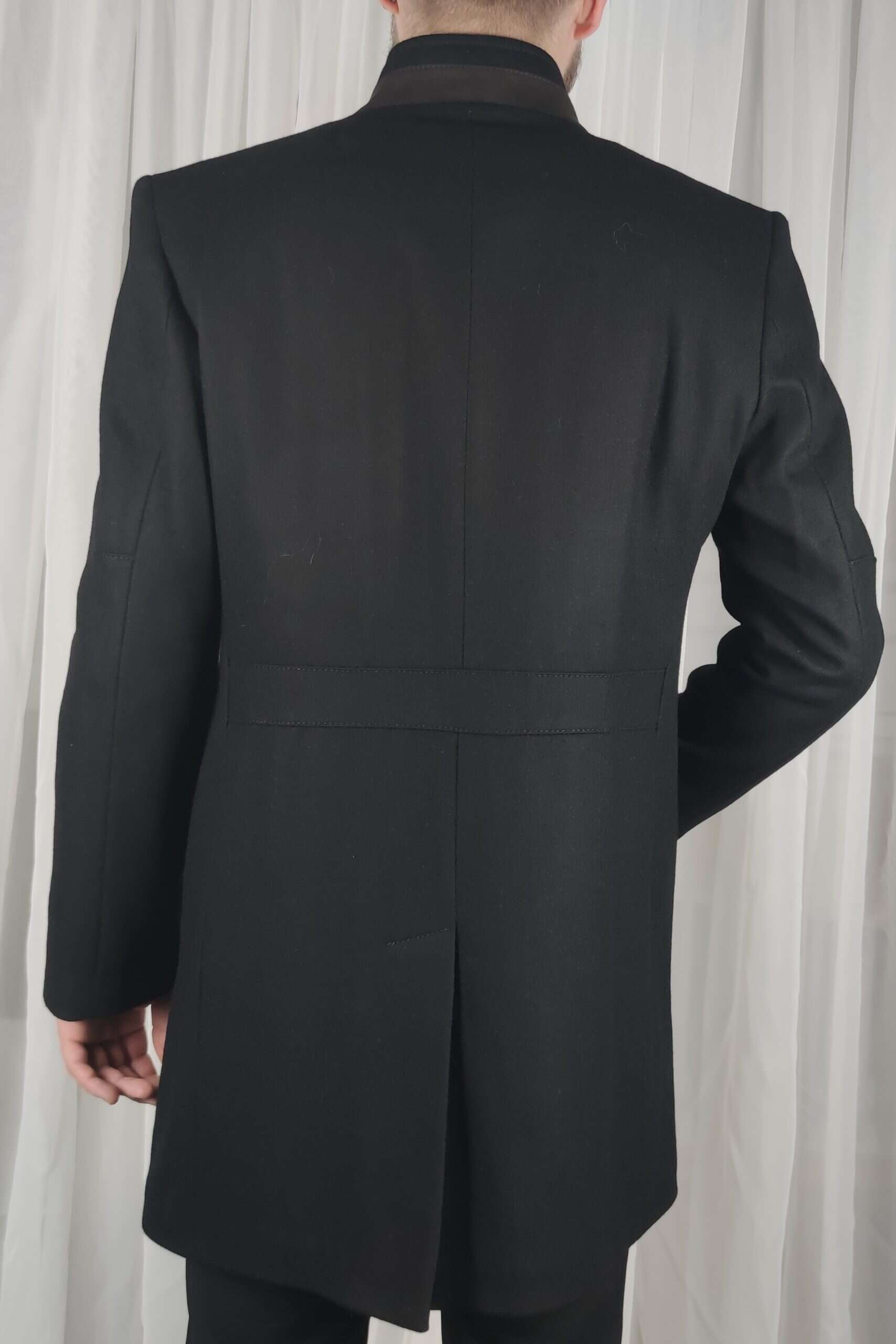 Pánsky elegantný čierny kabát, zapínanie na zips, stojačik. dve vonkajšie vrecká, rázporok v zadu.