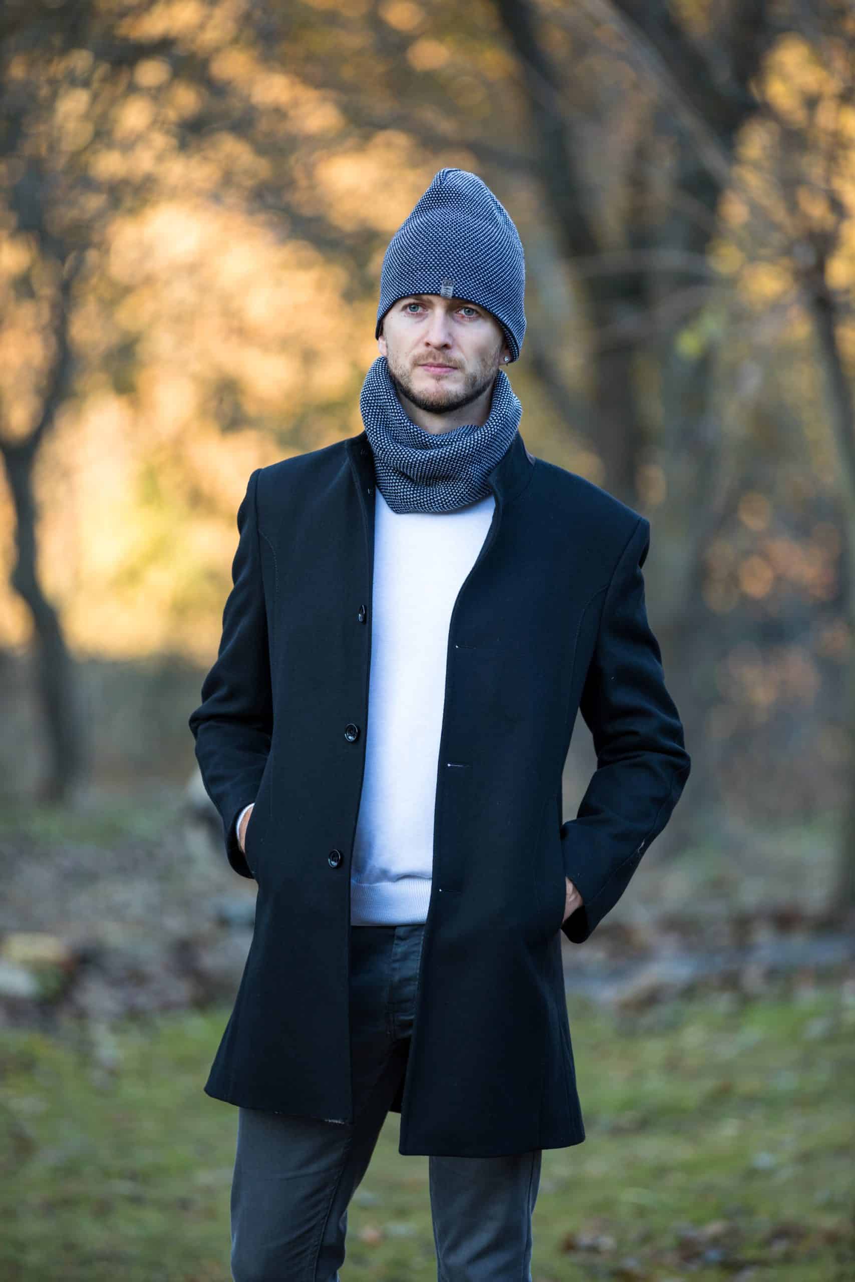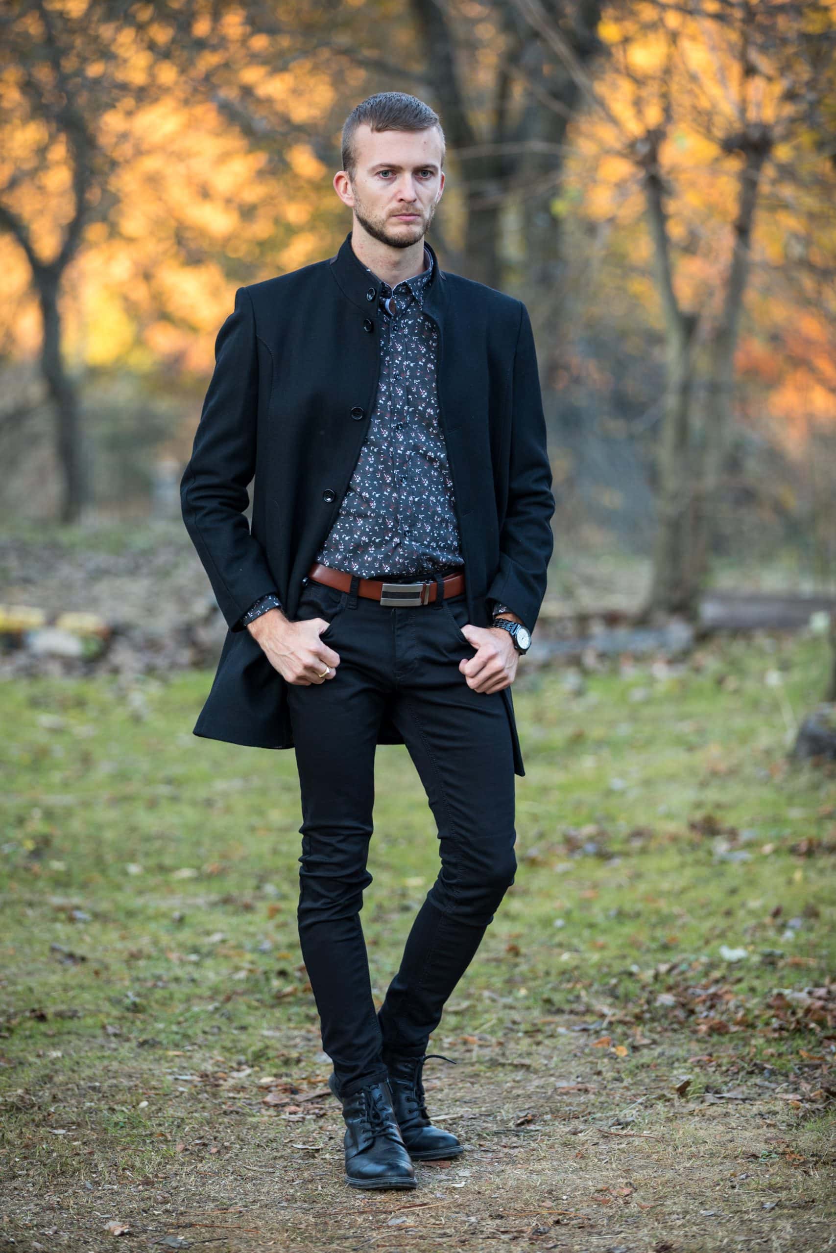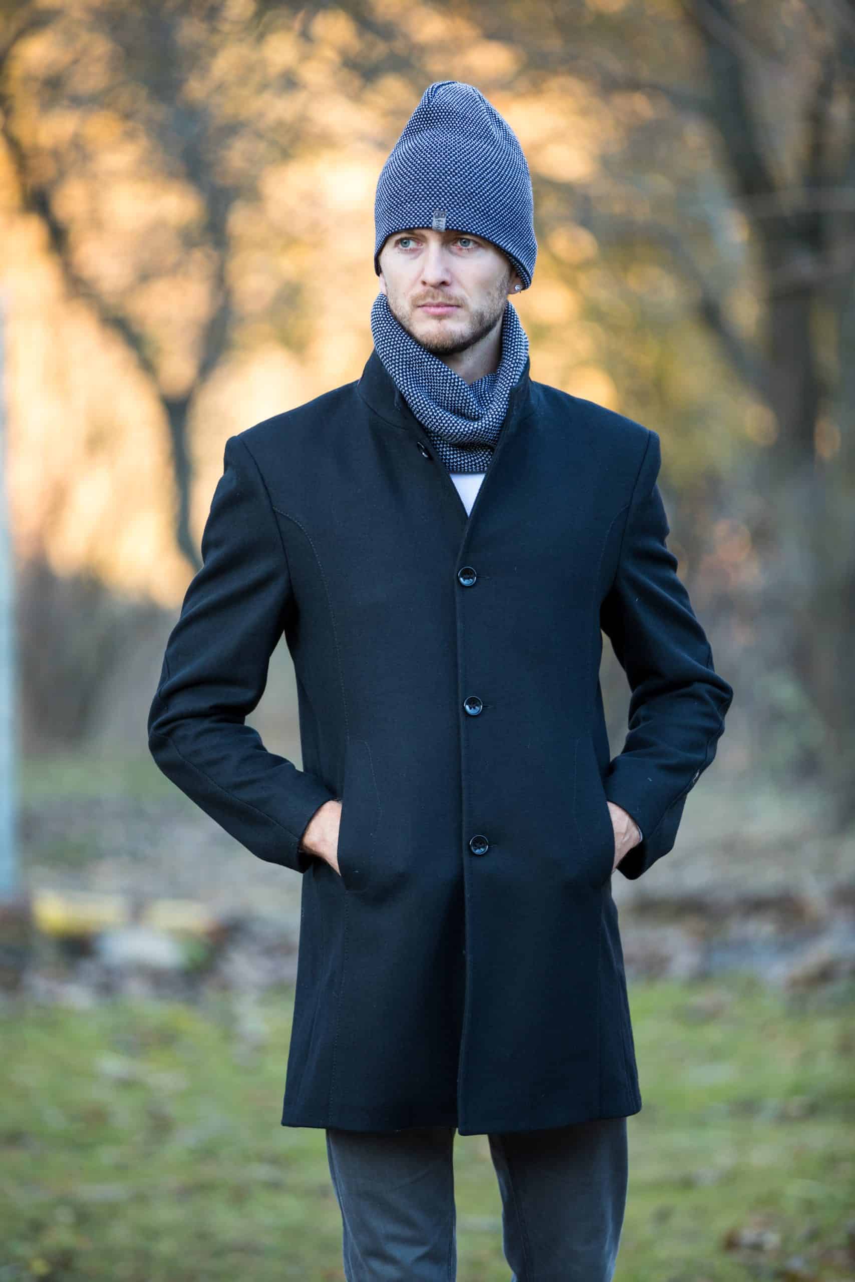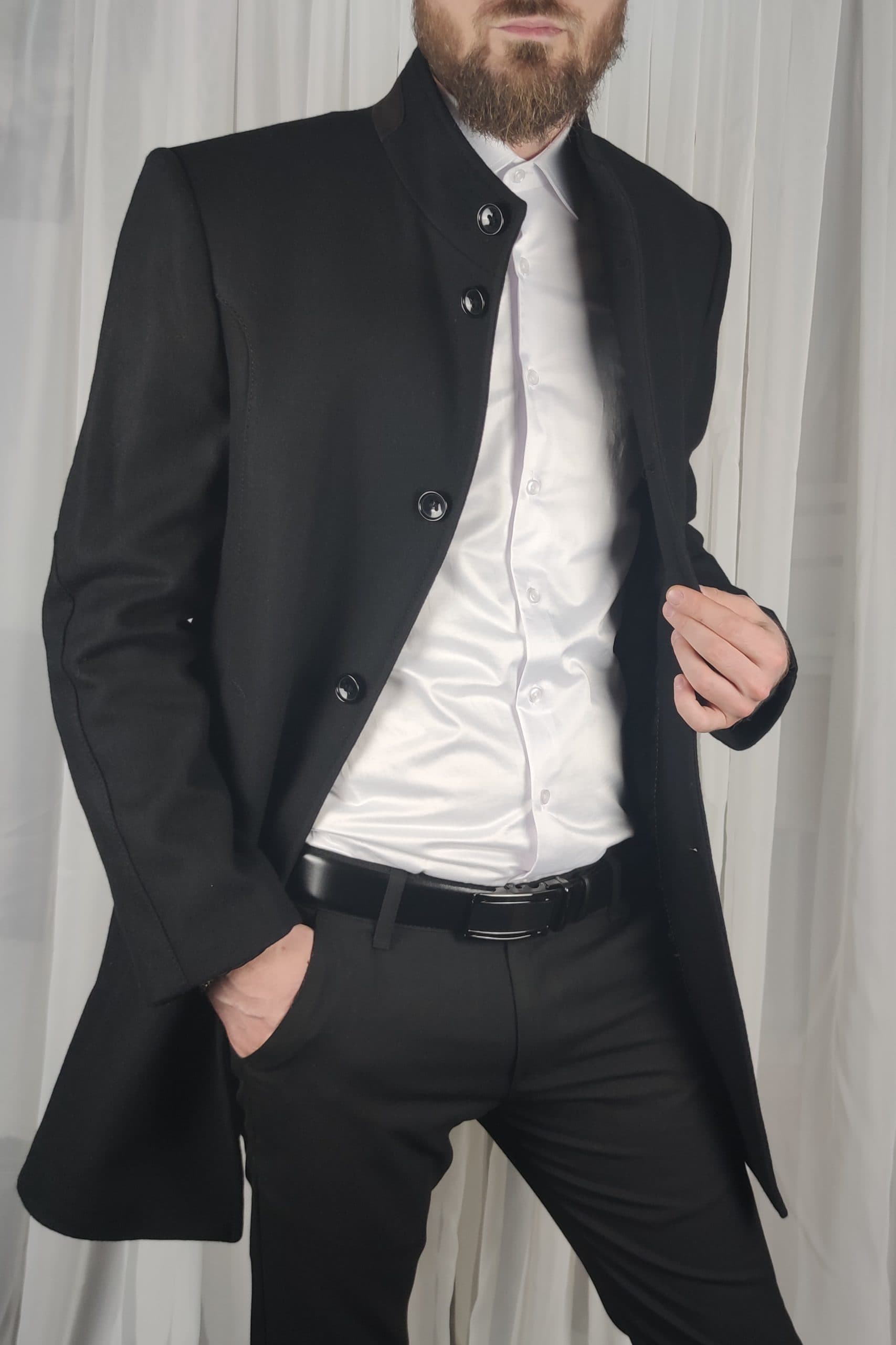 Pánsky elegantný čierny kabát, zapínanie na zips, stojačik. dve vonkajšie vrecká, rázporok v zadu.