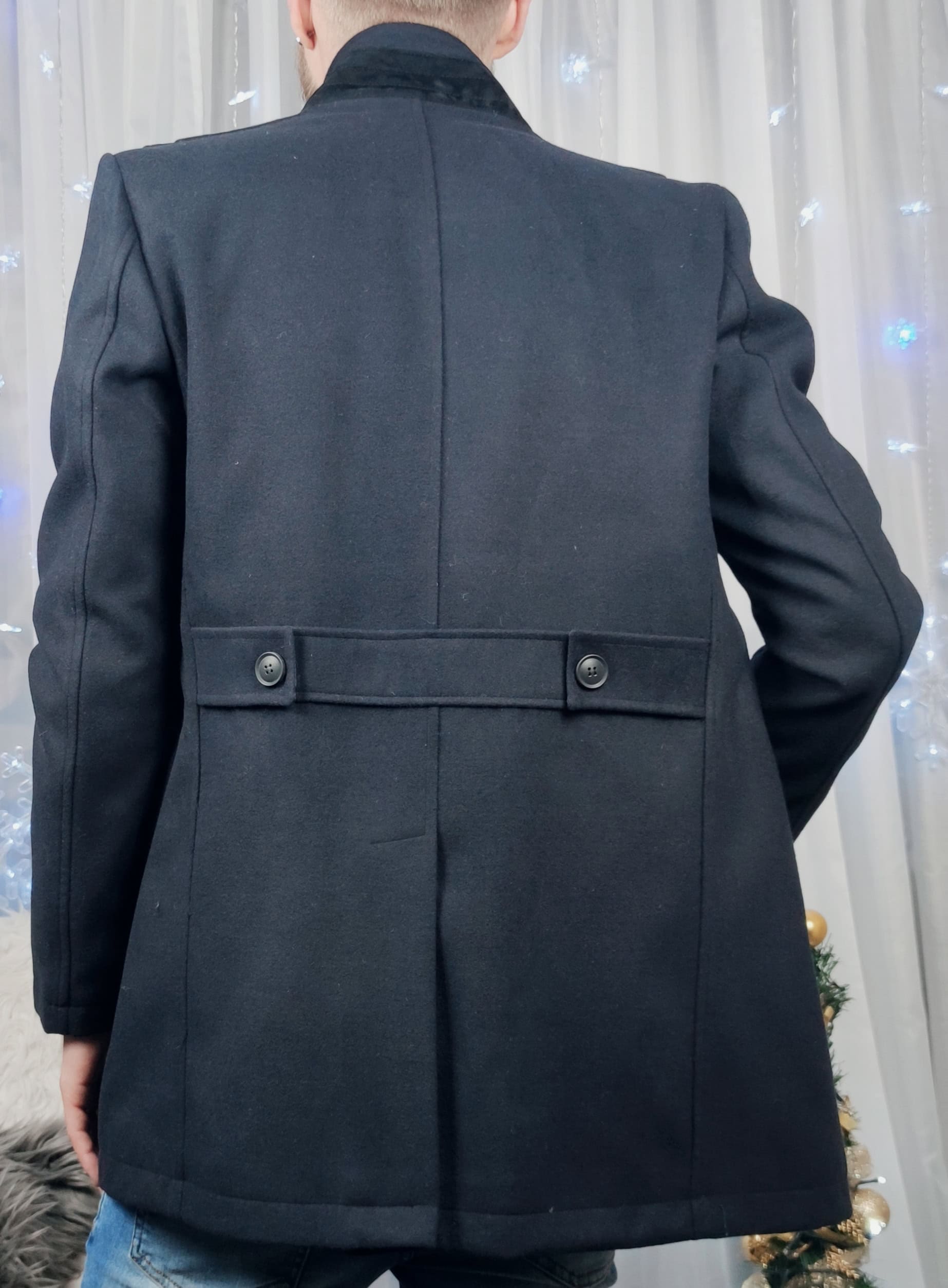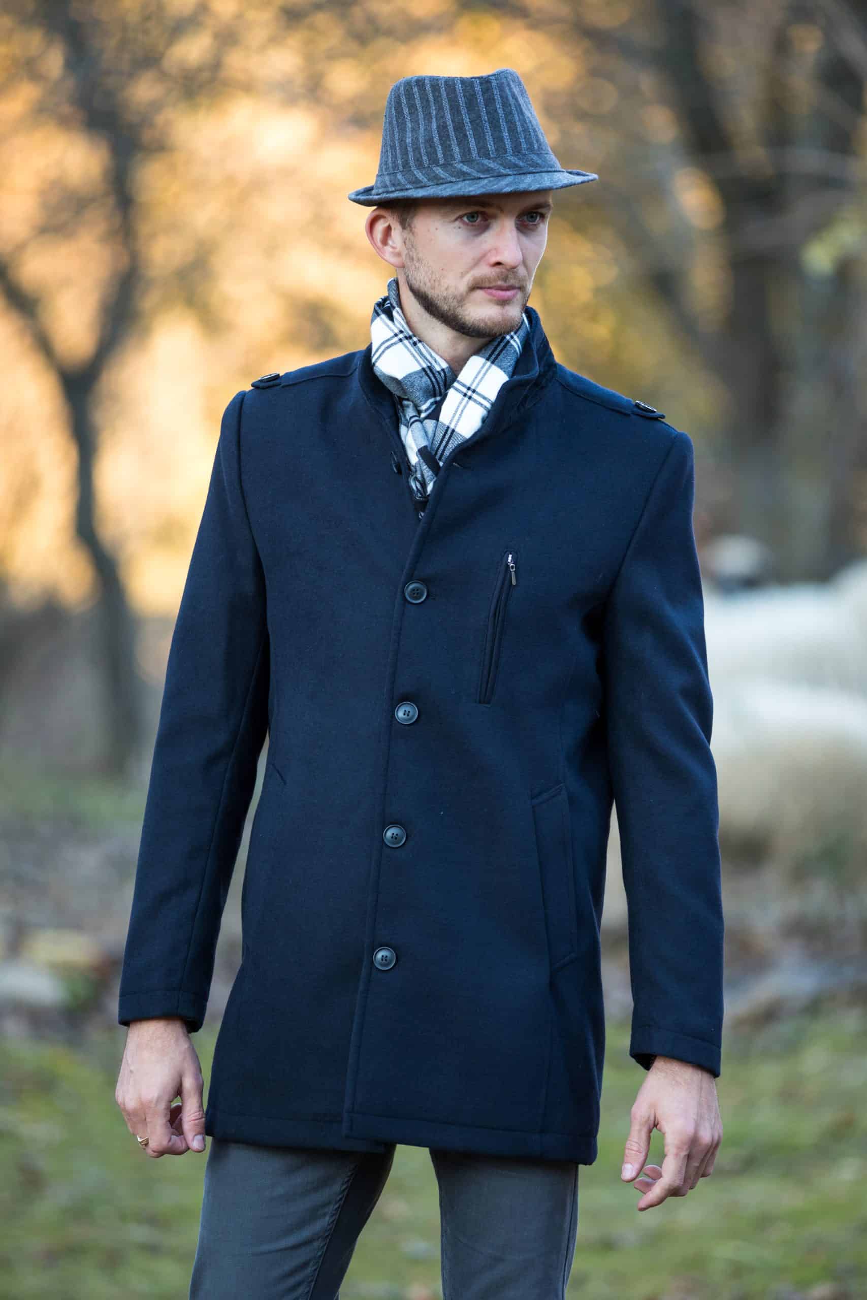 | Popis | Pánsky elegantný tmavo modrý kabát, zapínanie na gombíky, náprsné vrecko so zipsom, ,,výložky" na pleciach, dve vonkajšie vrecká |