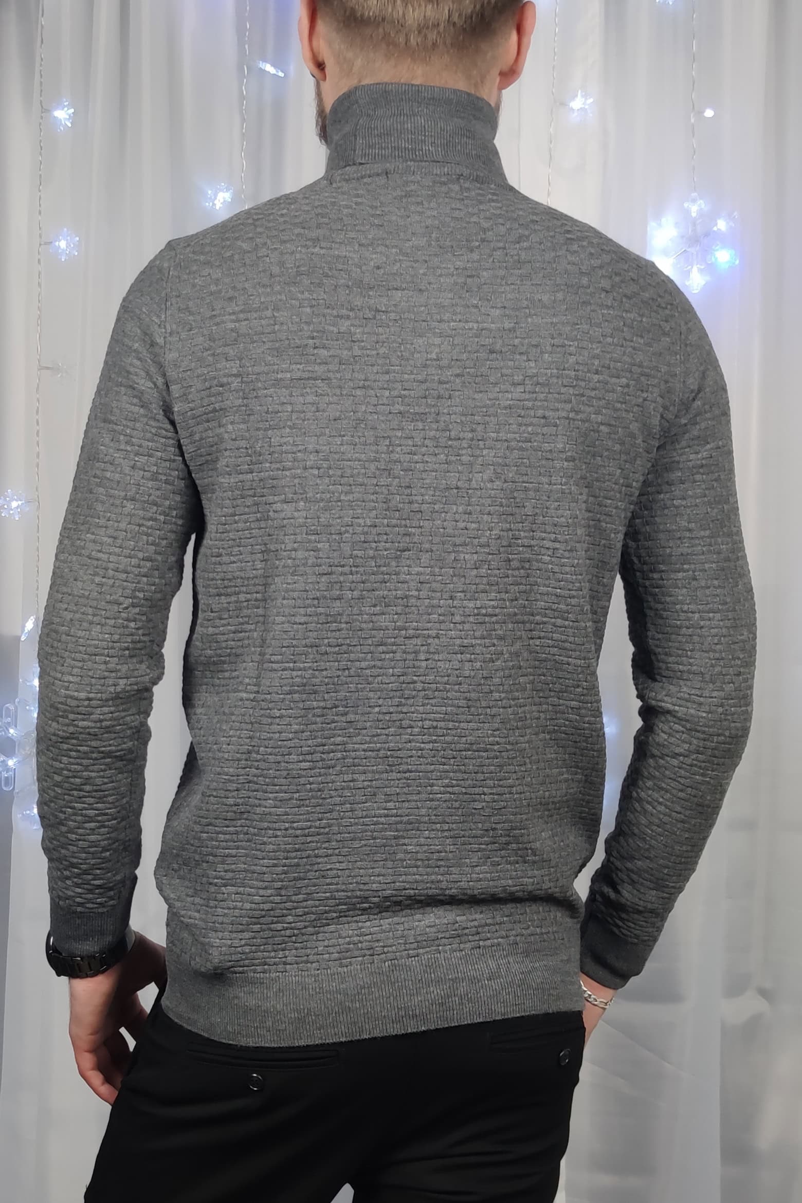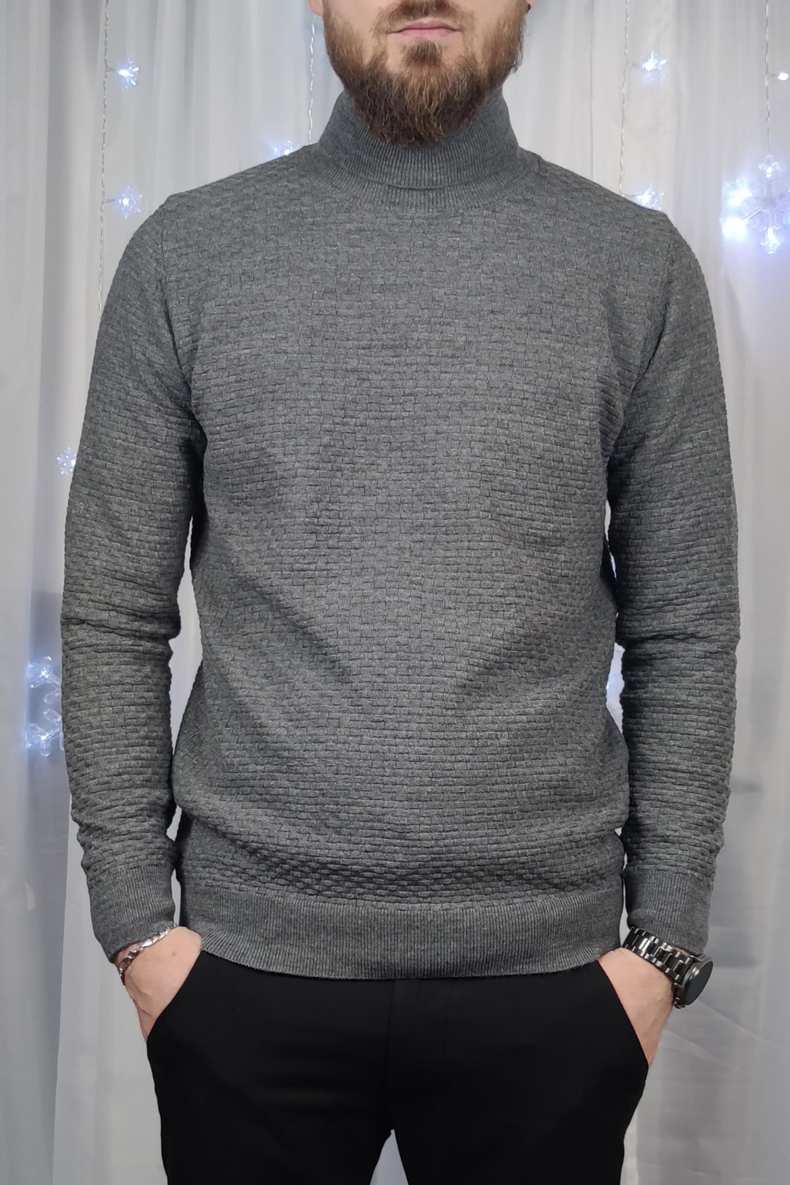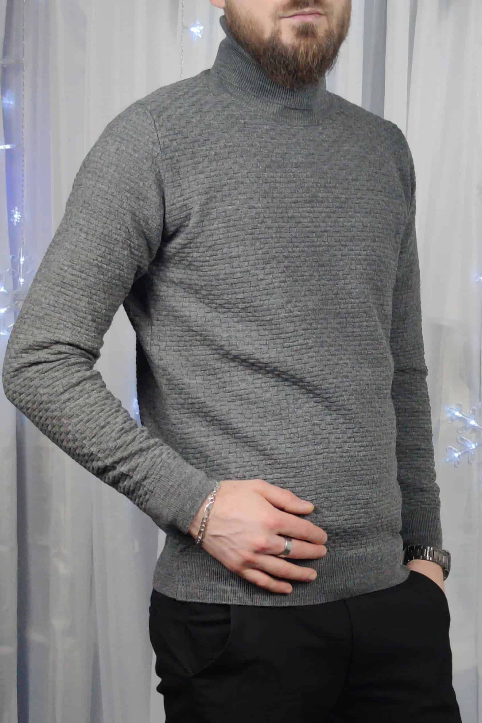 Elegantný pánsky sivý rolák so vzorom. Spodná časť a rukávy sú ukončené lemom.
