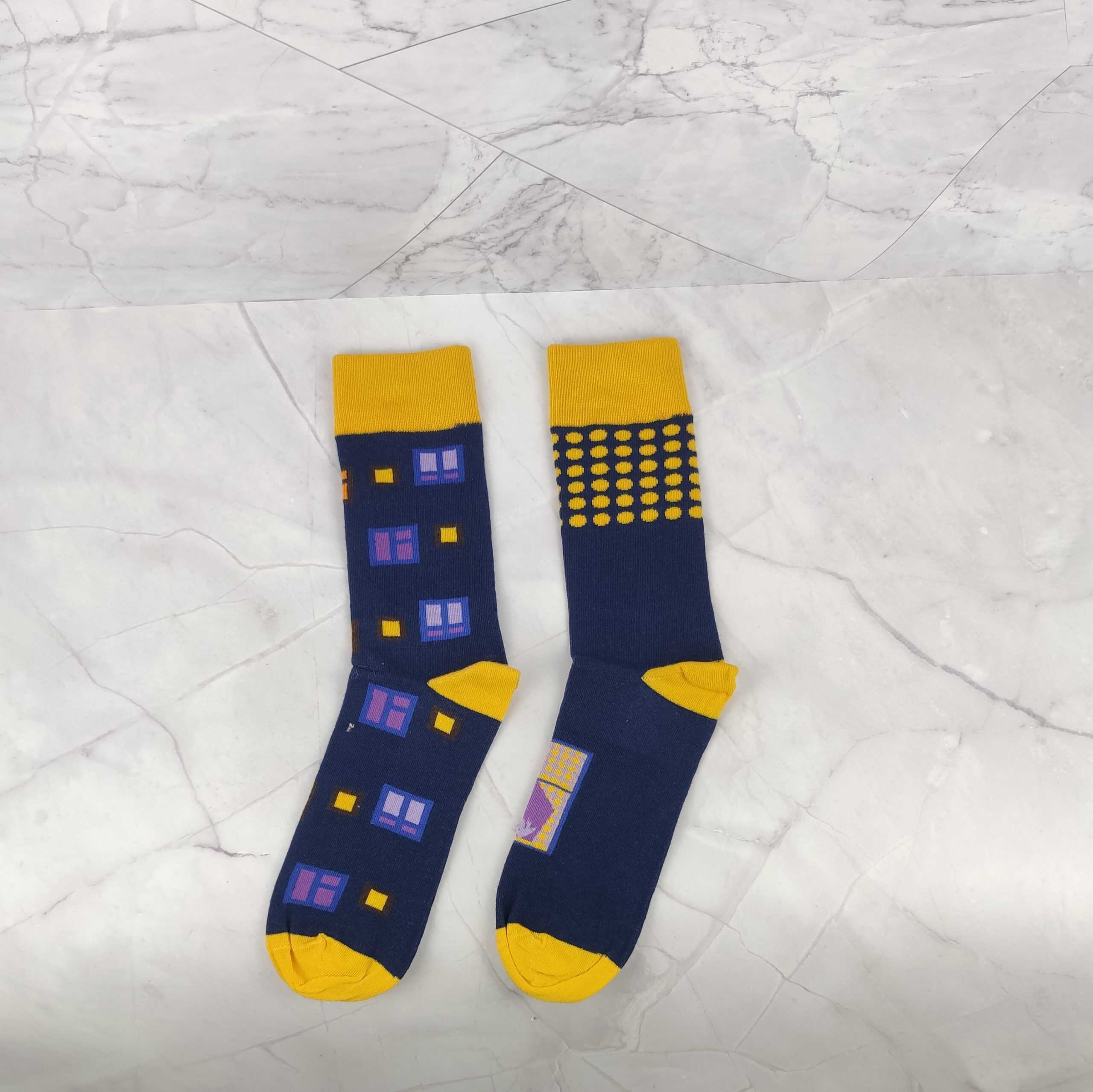| Popis | Pánske veselé ponožky, tmavomodré, so vzorom. |